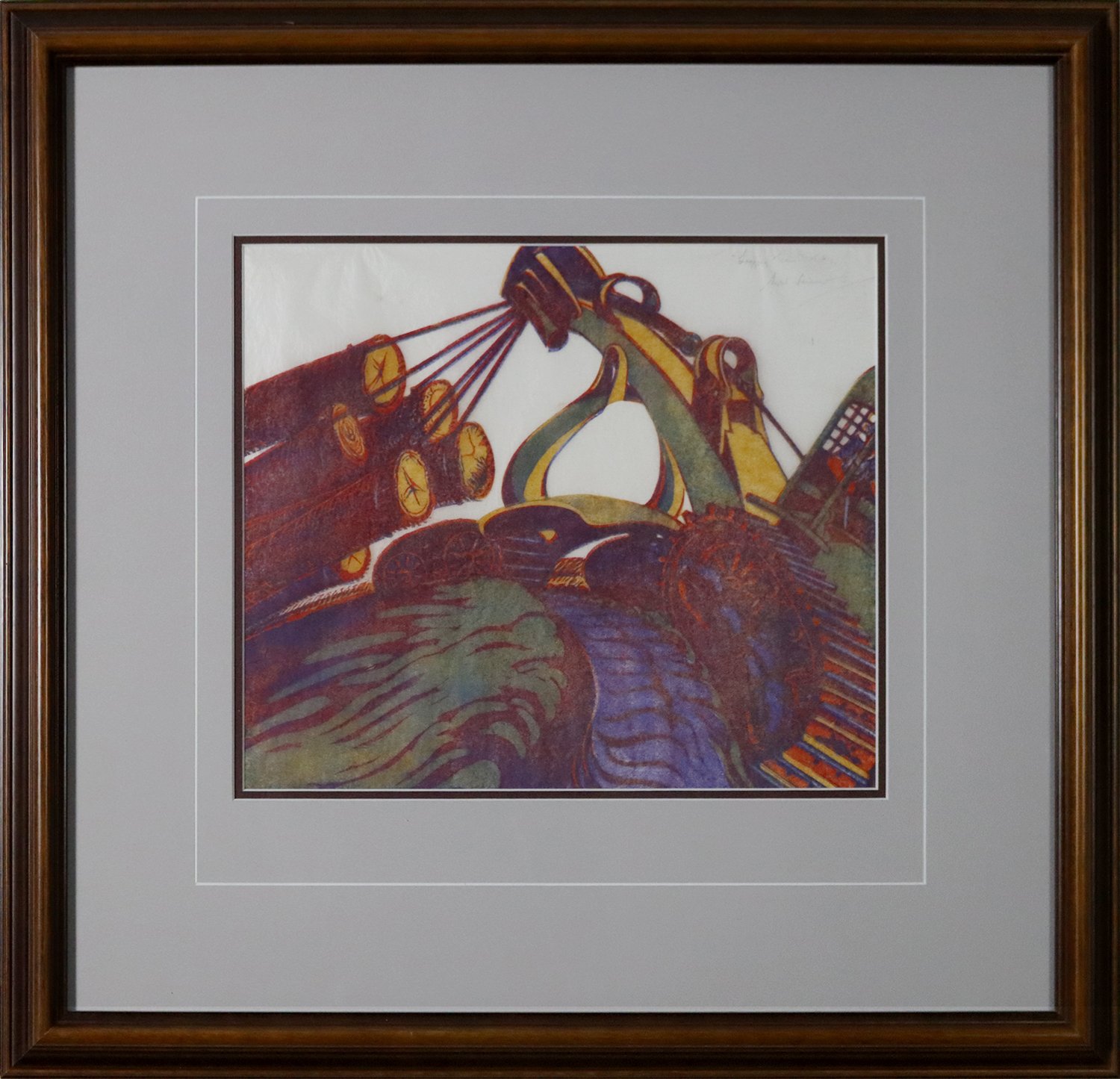 “Campbell River, Andrews’ new home, was an isolated logging town, and is represented in a number of her prints including Hauling and Coffee Bar” Hana Leaper, Sybil Andrews Linocuts: A Complete Catalogue.