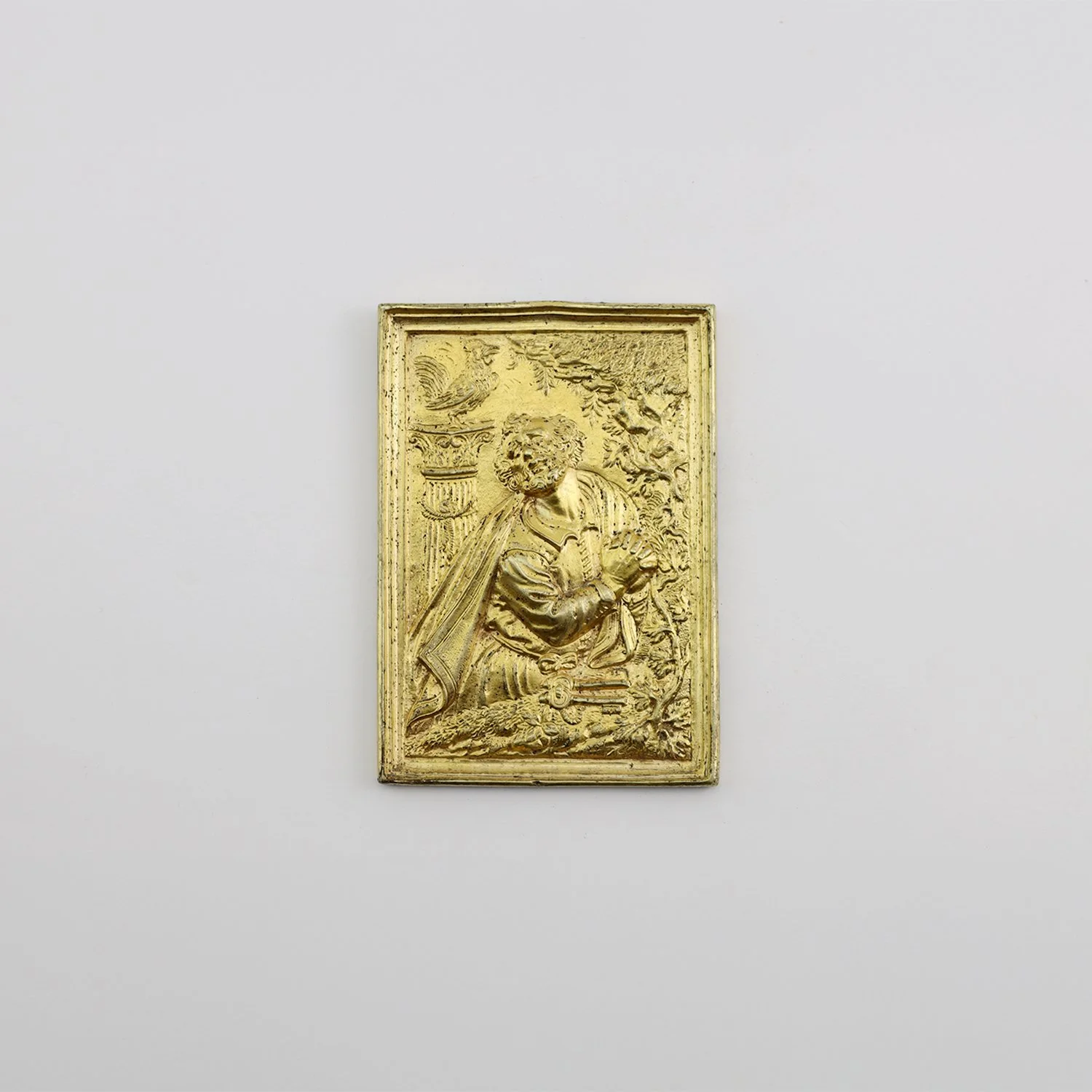 Finely detailed Spanish early 17th century Renaissance gilt wax-cast and chased bronze plaquette depicting Saint Peter as a Penitent, Attributed to the Master of the Penitent Saints, Spain. Suspension loop missing. Inscribed "N" on reverse.