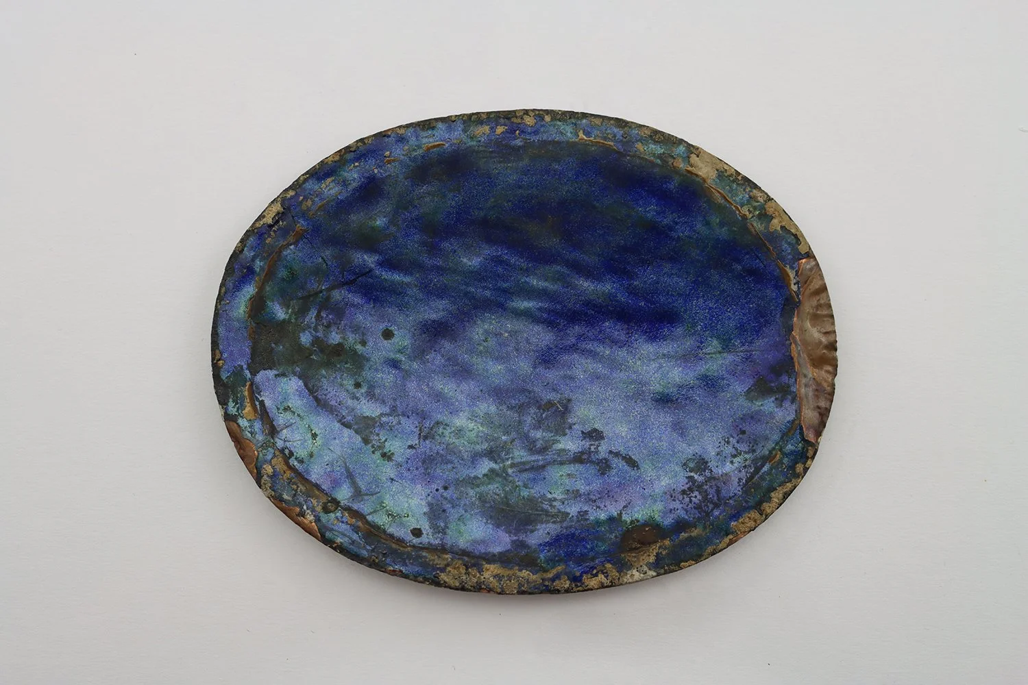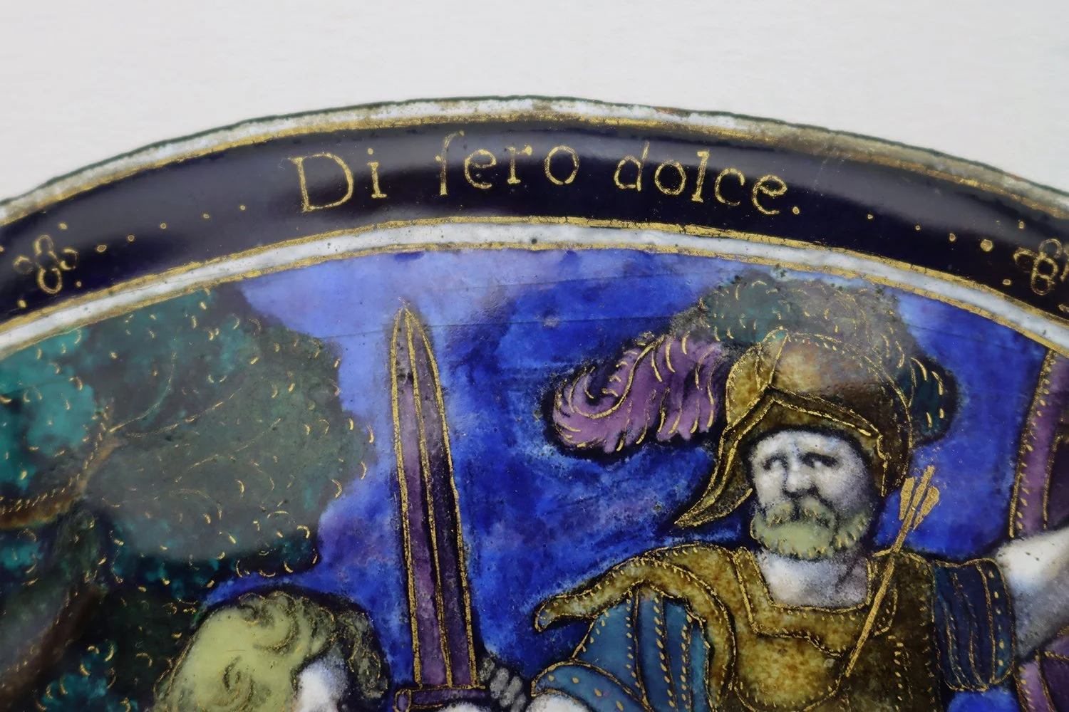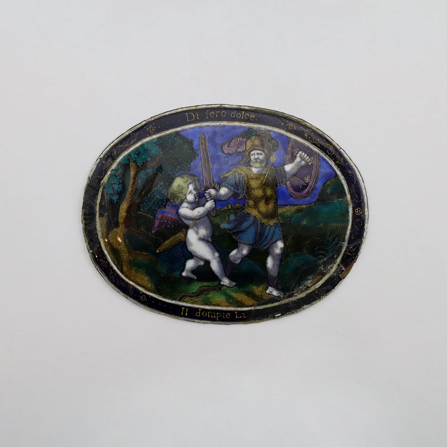 Domed oval Limoges plaque in polychrome painted enamel with gold highlights, with inscription "Di fero dolce/Il dompte La…", with some damage to edges, 18th century