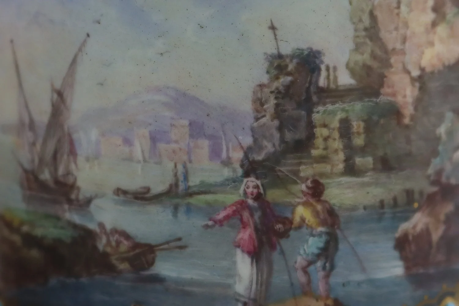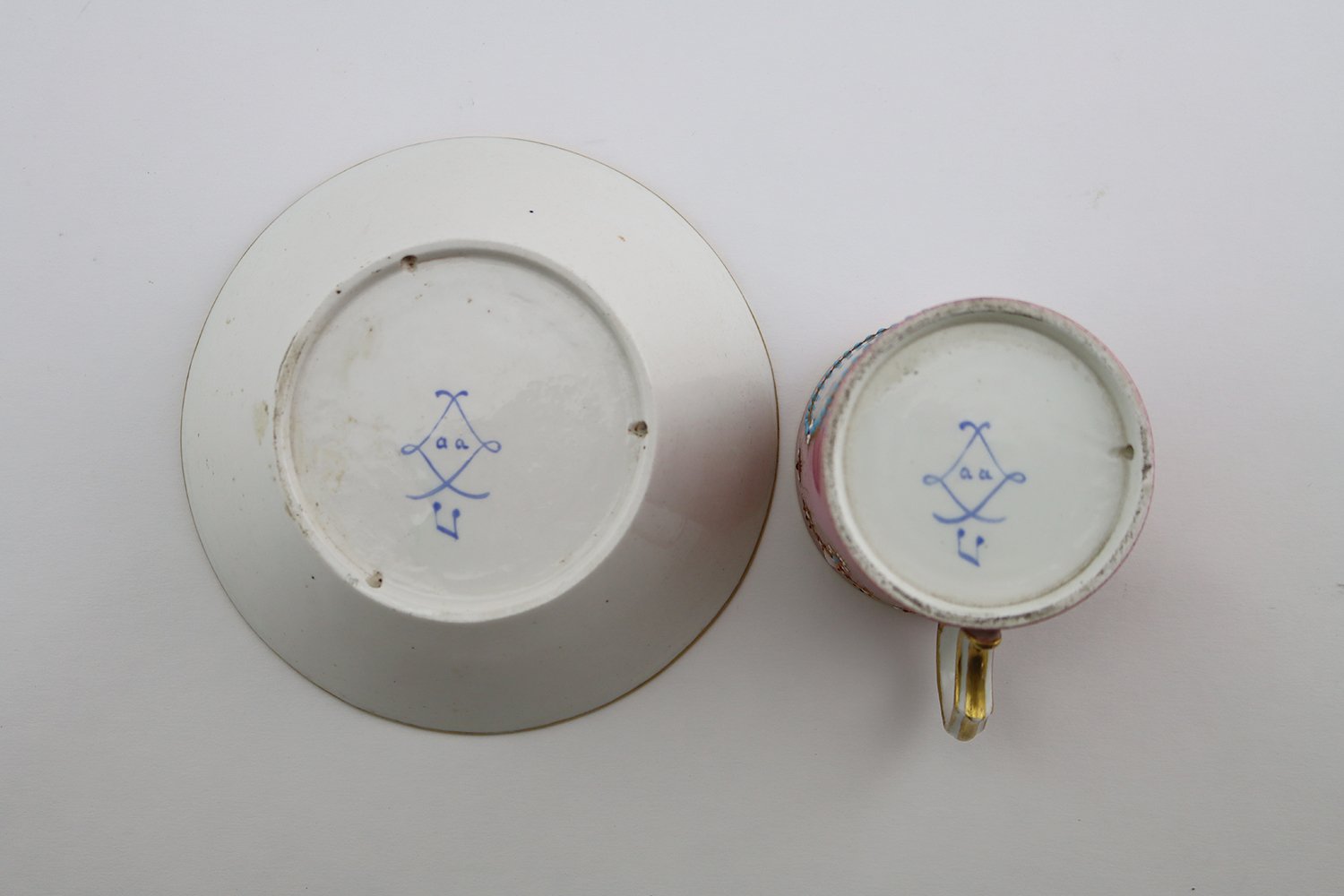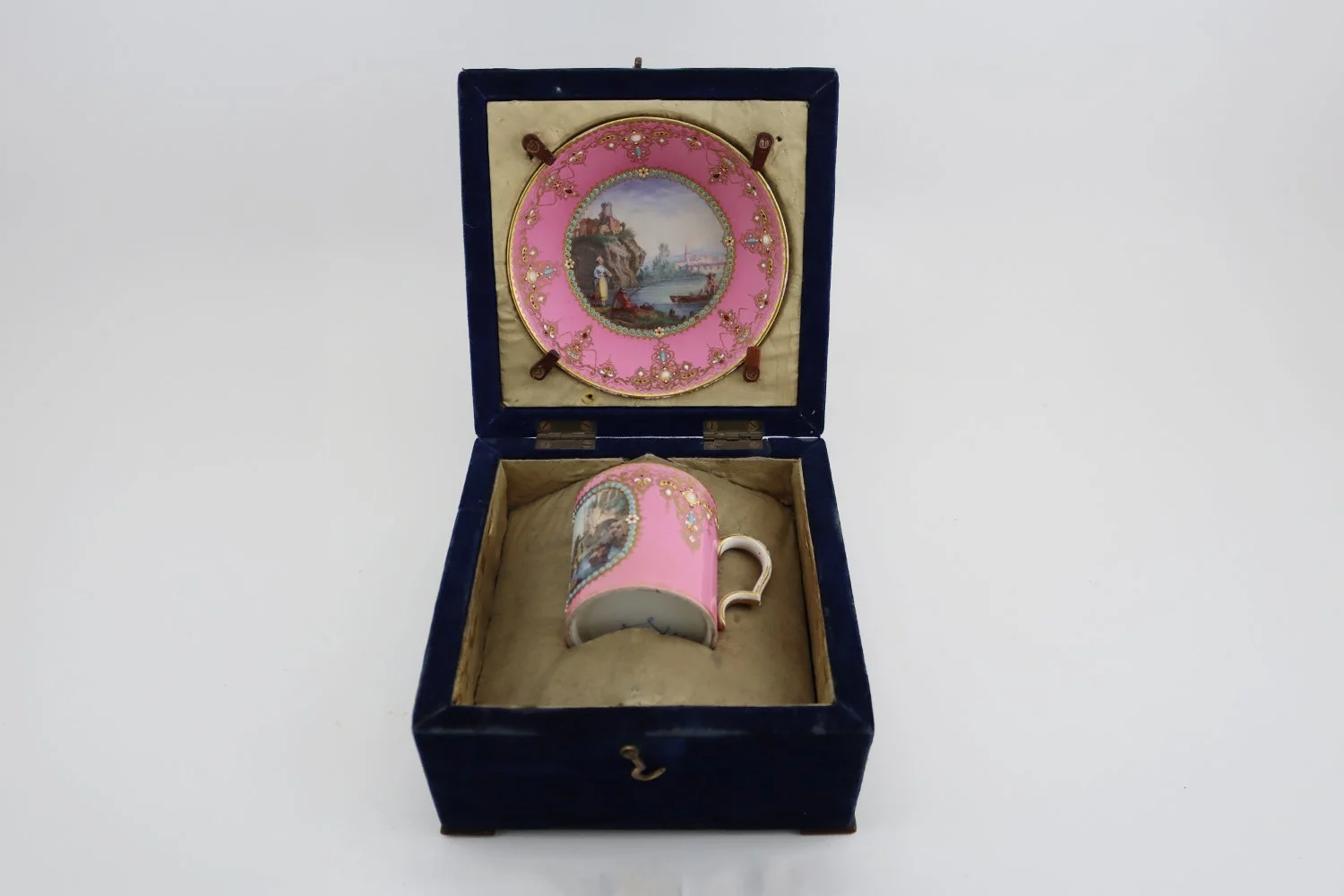 Sevres jeweled cabinet cup and deep saucer, both cup and saucer with painted Sevres date mark for 1778 and maker's mark for Louis-Gabriel Chulot (1755-1800), the cup and saucer vignettes with fine hand-painted landscapes, figures and boats, in fitted box