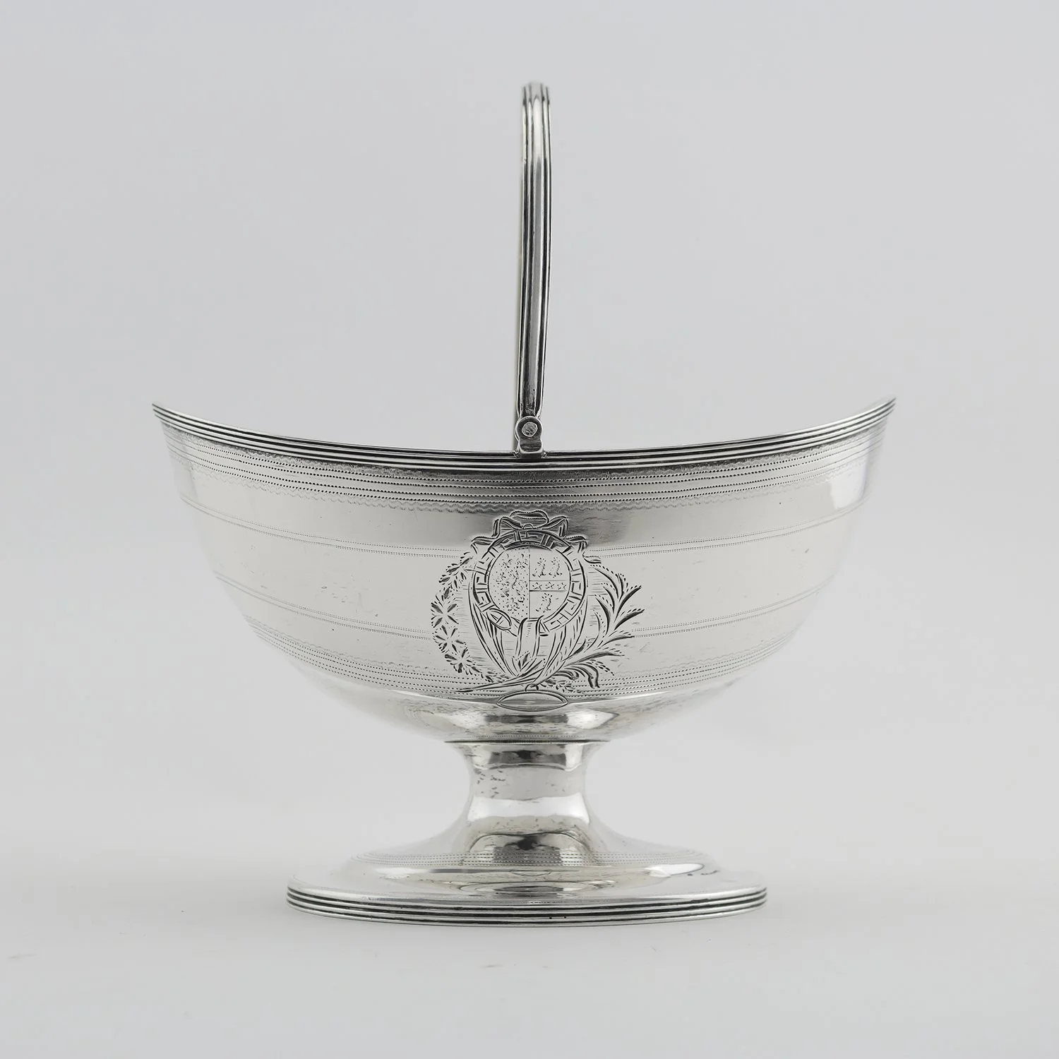 George III sterling silver sweetmeat basket, the boat-shaped bowl with reeded borders and monogram, with swing handle and raised on a flared oval foot, hallmarked for London 1795 and makers mark for Robert and David Hennell