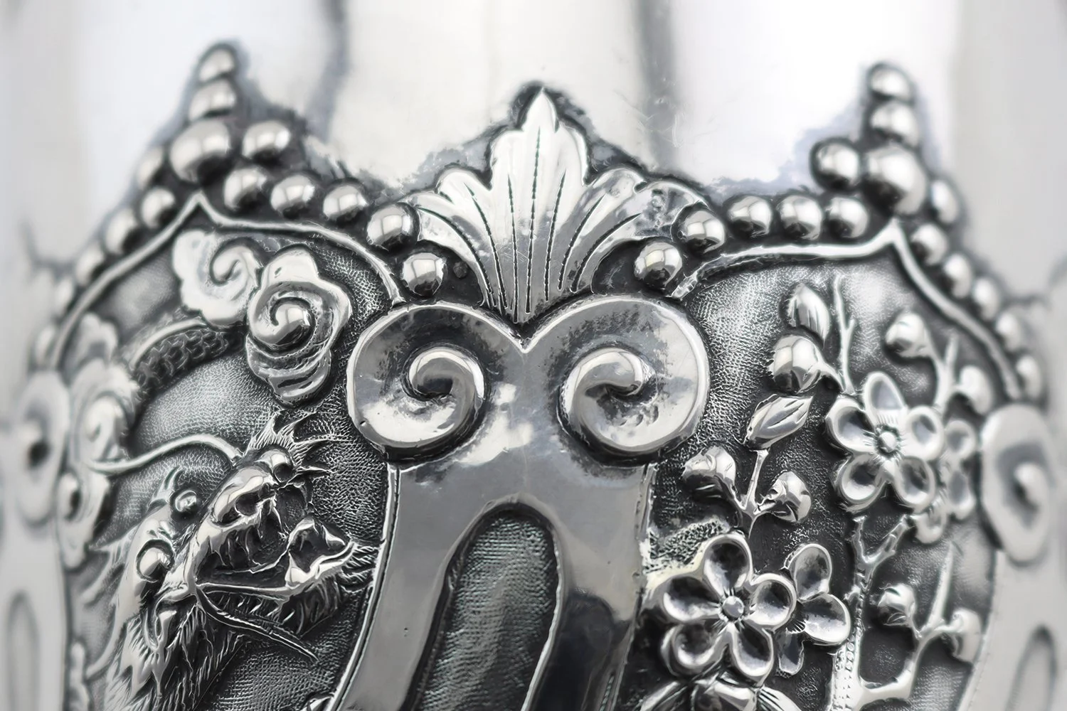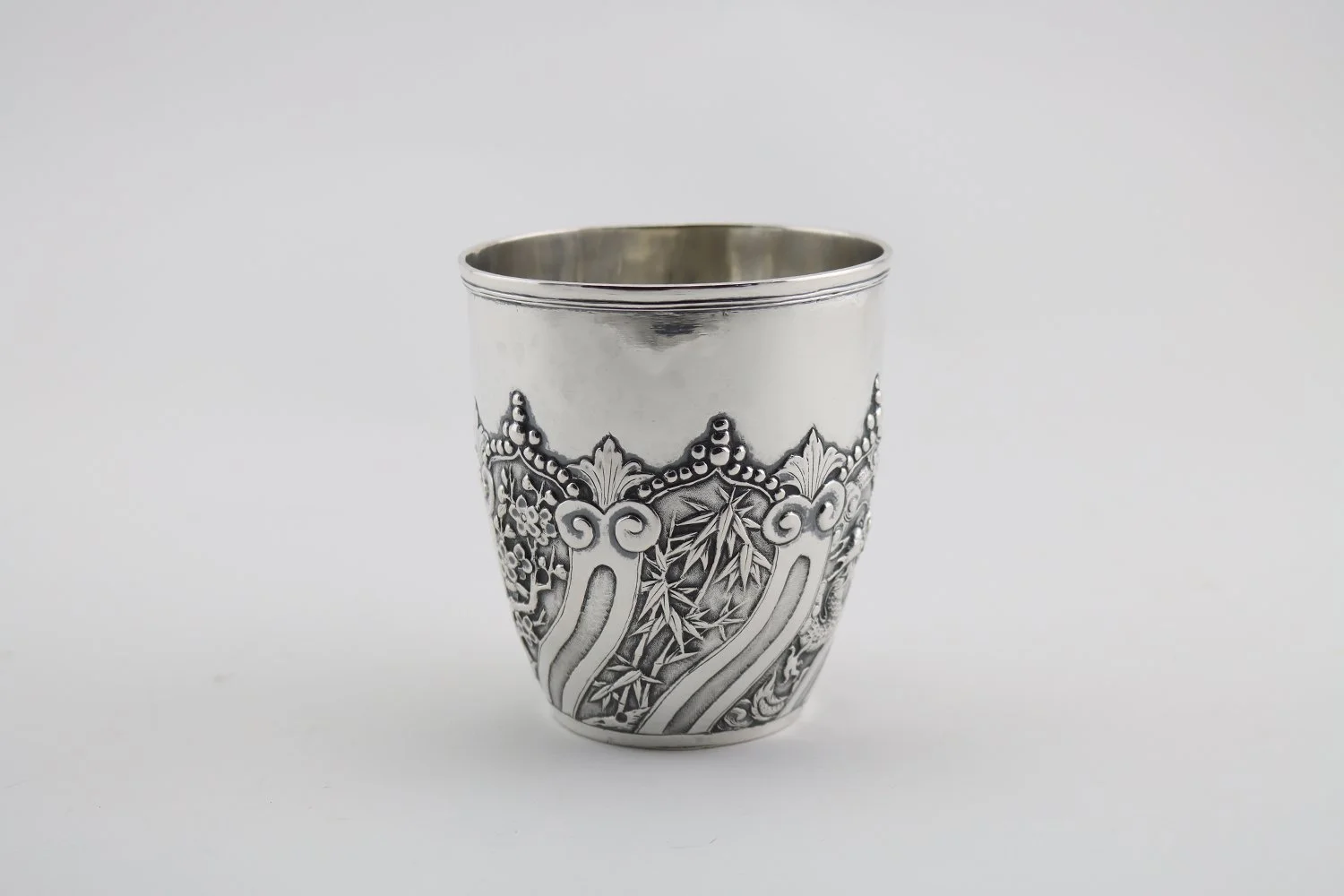 Chinese Export silver cup of cylindrical form, with finely embossed decoration of design of prunus flowers, bamboo and dragons (for perseverance and authority) and scrollwork, hallmarked for Hung Chong & Co. 1860-1930 Canton & Shanghai