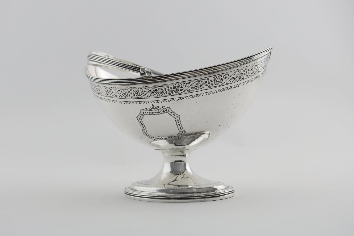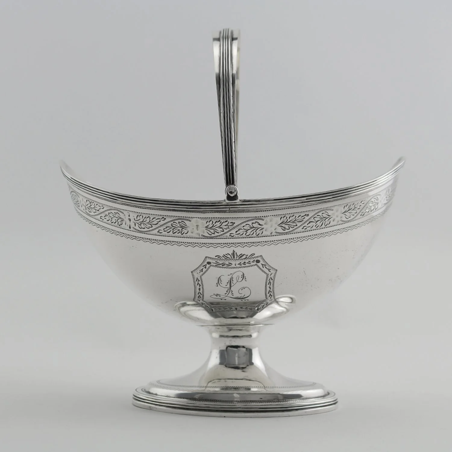 George III sterling silver sweetmeat basket, the boat-shaped bowl with bright cut decoration, inscribed with monogram "L", with swing handle and raised on a flared oval reeded foot, hallmarked for London 1797 and maker mark for Henry Nutting or Hannah Northcote Robert and David Hennell