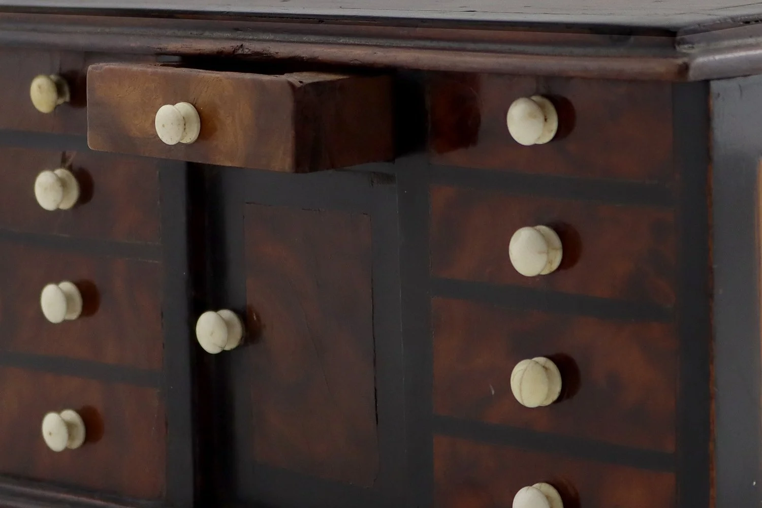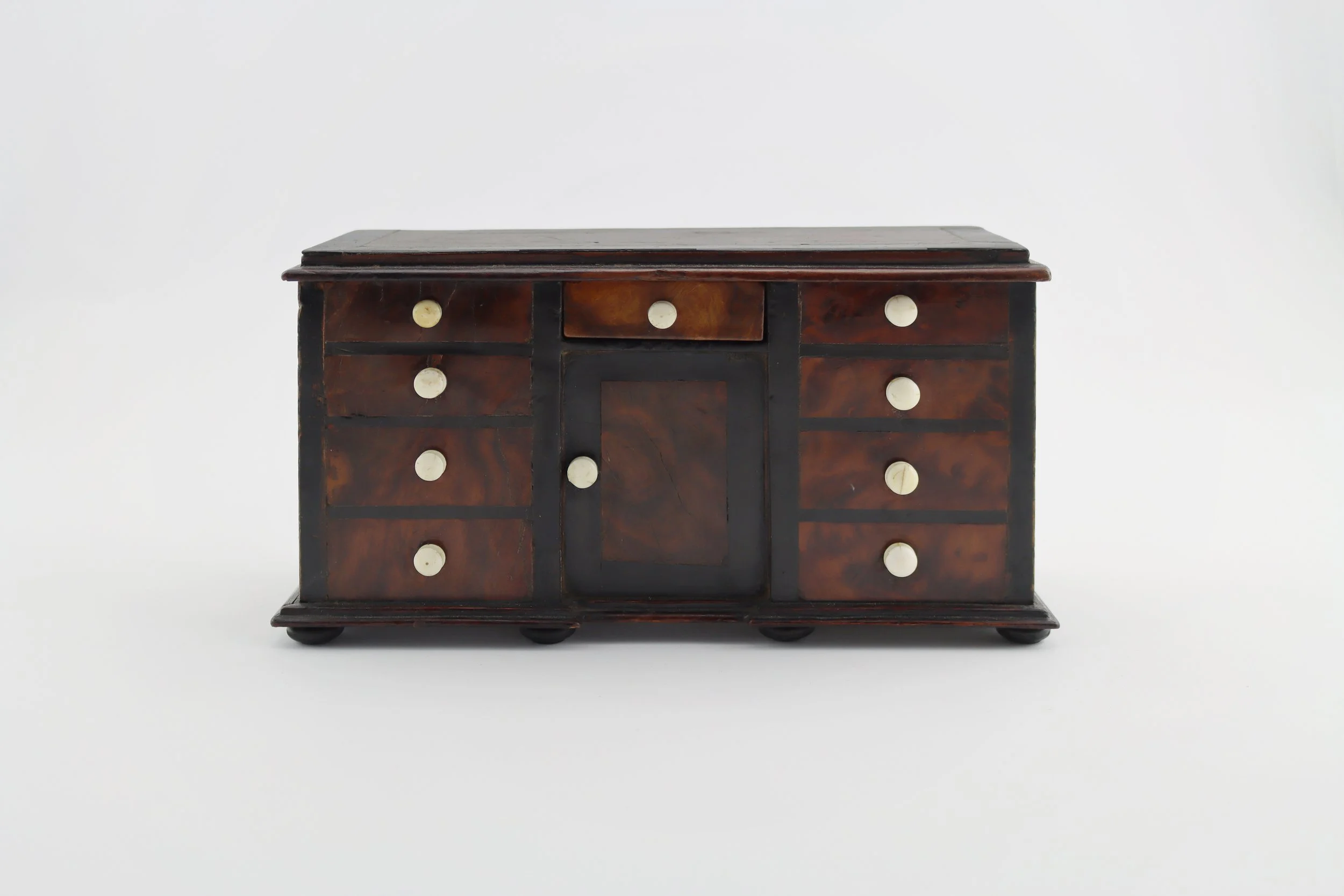 Miniature coin bank and lock box in the shape of a sideboard, inlaid walnut with 10 ivory handles, top center drawer opens to reveal a coin drop, the back with lock for opening lifting swing door (no key), 19th century