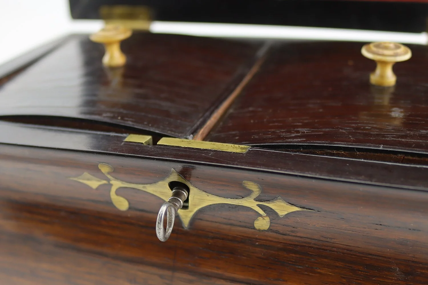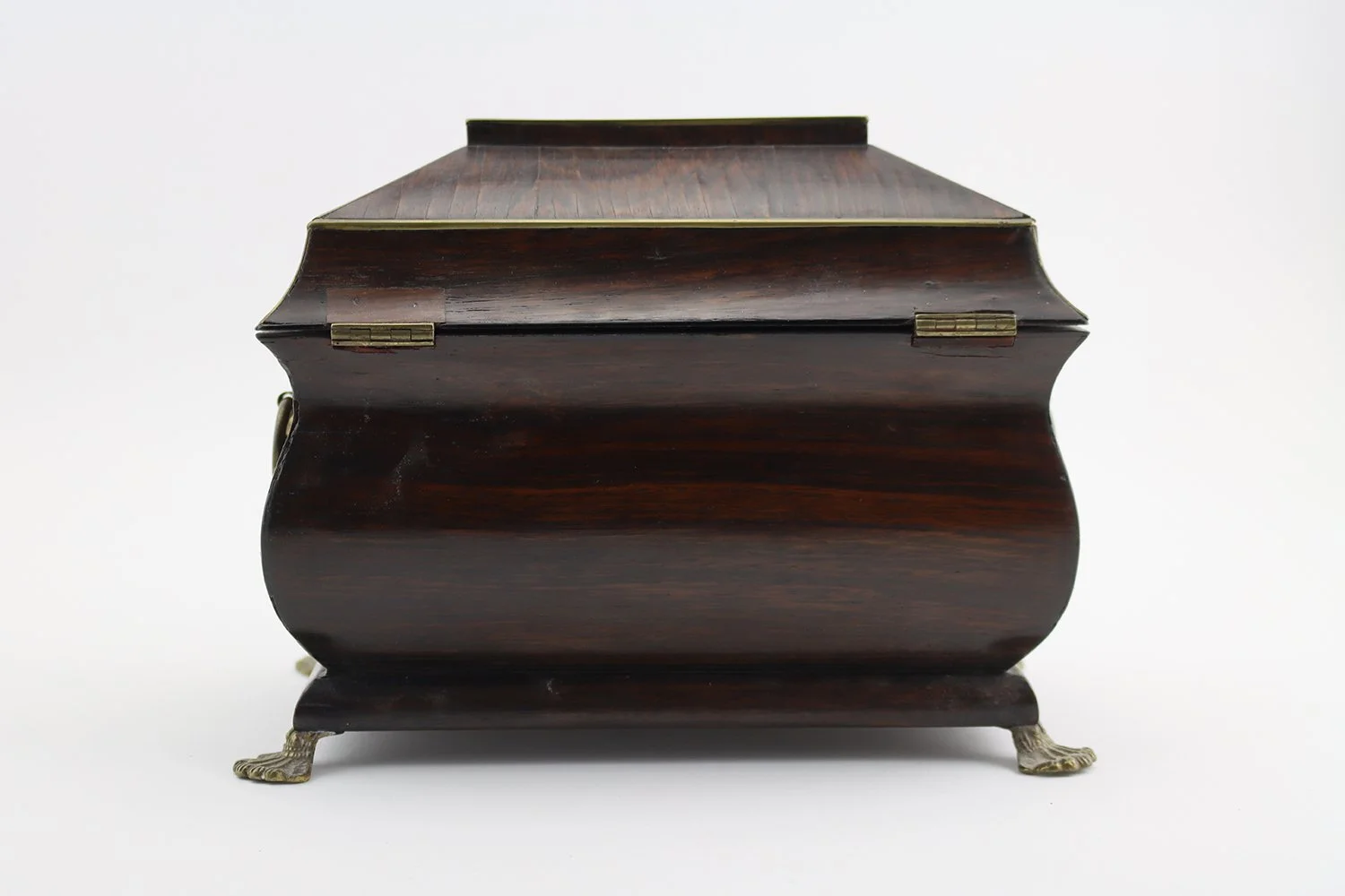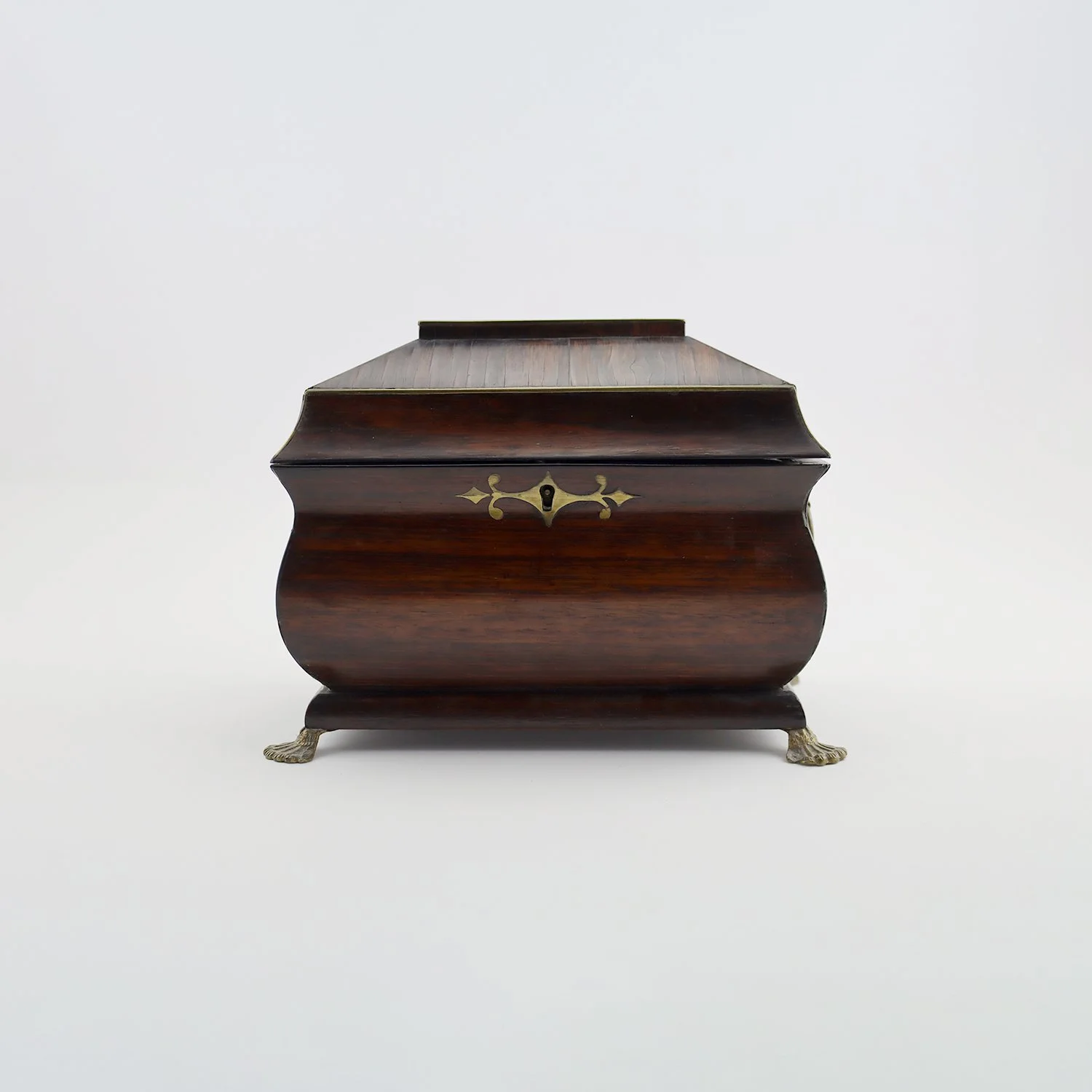 18th century rosewood brass strung bombe shaped tea caddy with hinged lid, opening to reveal twin tea compartments the lids with ivory handles, with remains of zinc leaded interior, original brass paw feet and side handles, working lock and key, English circa 1780