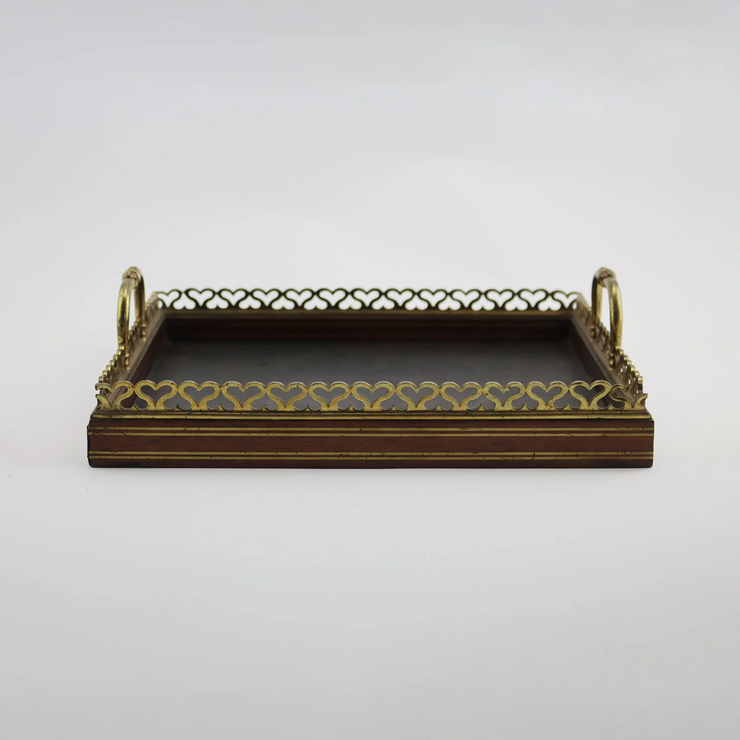 Early 19th century English desk tray with open brass gallery and handles, inlaid brass stringing lines and leather center, bottom stamped "Howard & Sons/Berners St"