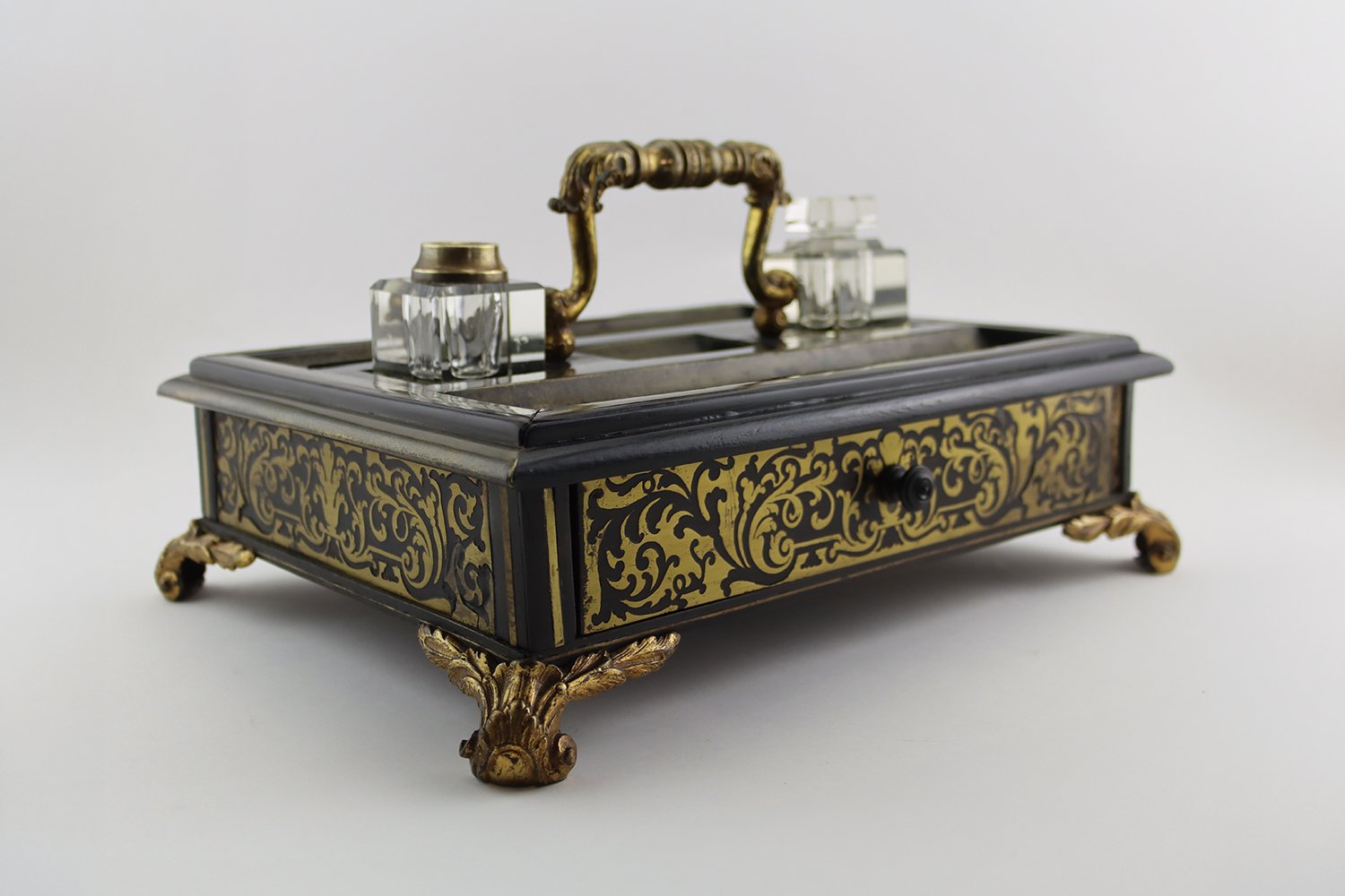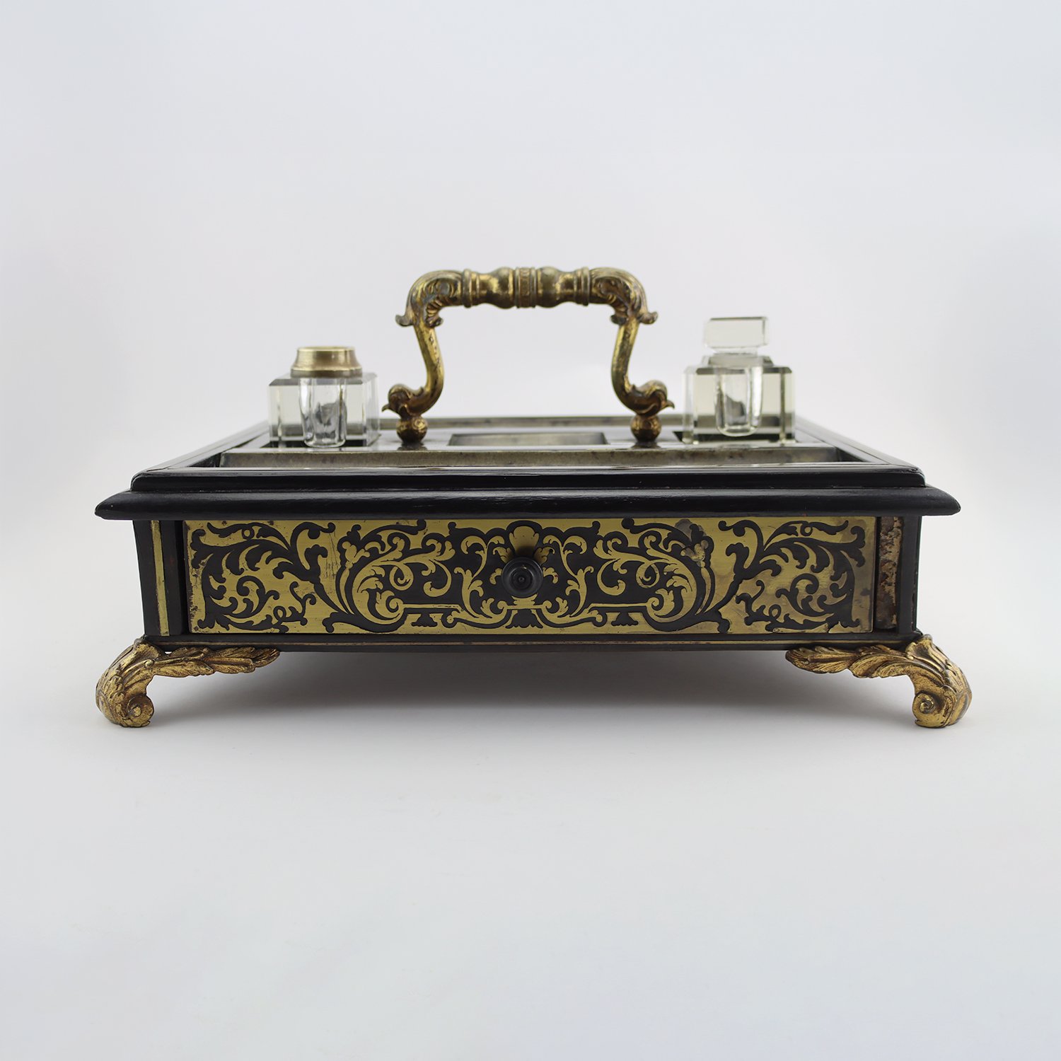 Freestanding inlaid boulle desk organizer, having a quality ornate shaped brass handle flanked by a pair of cut glass inkwells above two pen trays, top decorated with brass inlay, sides all inlaid with brass work, the front drawer with original ornate wood knob, the whole raised on ornate brass feet. English mid 19th century