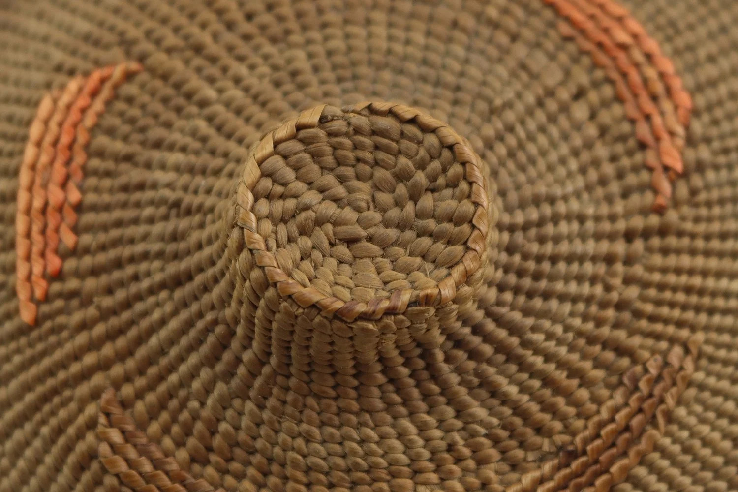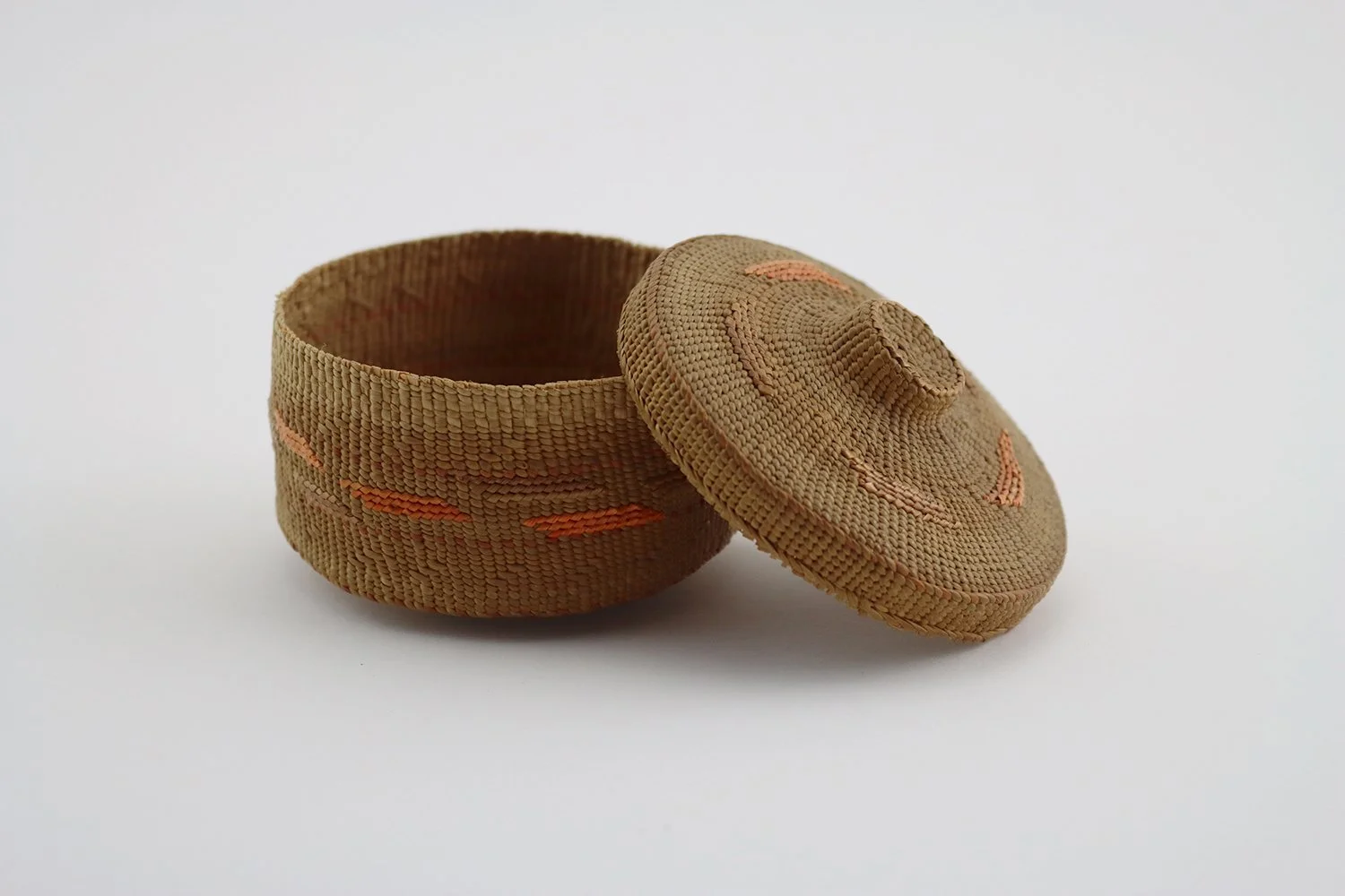 Fine Tlingit spruce root circular rattle top basket, with straight side, decorated with geometric design, the hollow knob handle on the center of the lid filled with small pebbles, circa 1880-1900