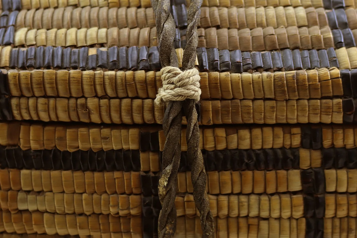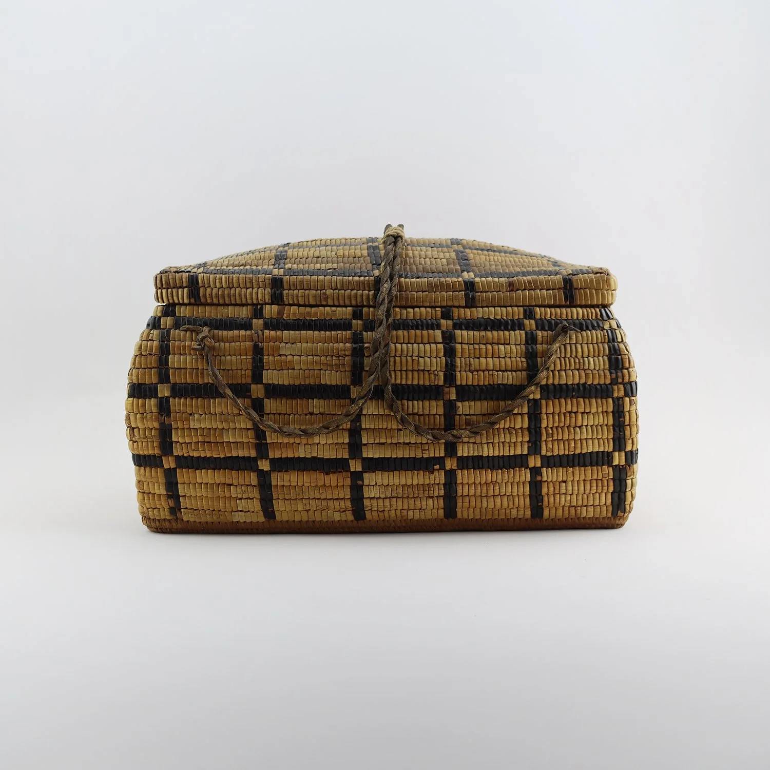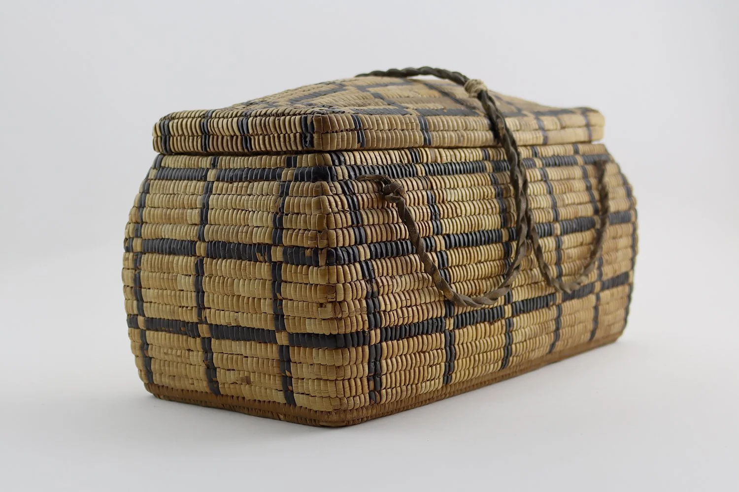 Fully imbricated Salish lidded basket with hinged lid and leather handles, imbricated with black geometric design, late 19th century