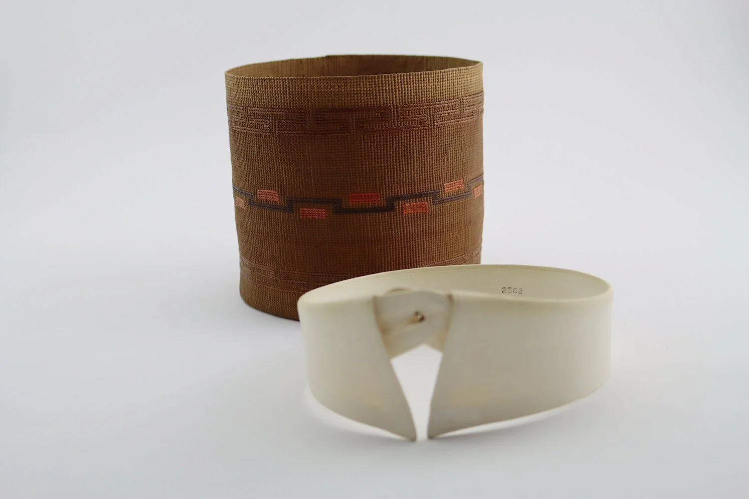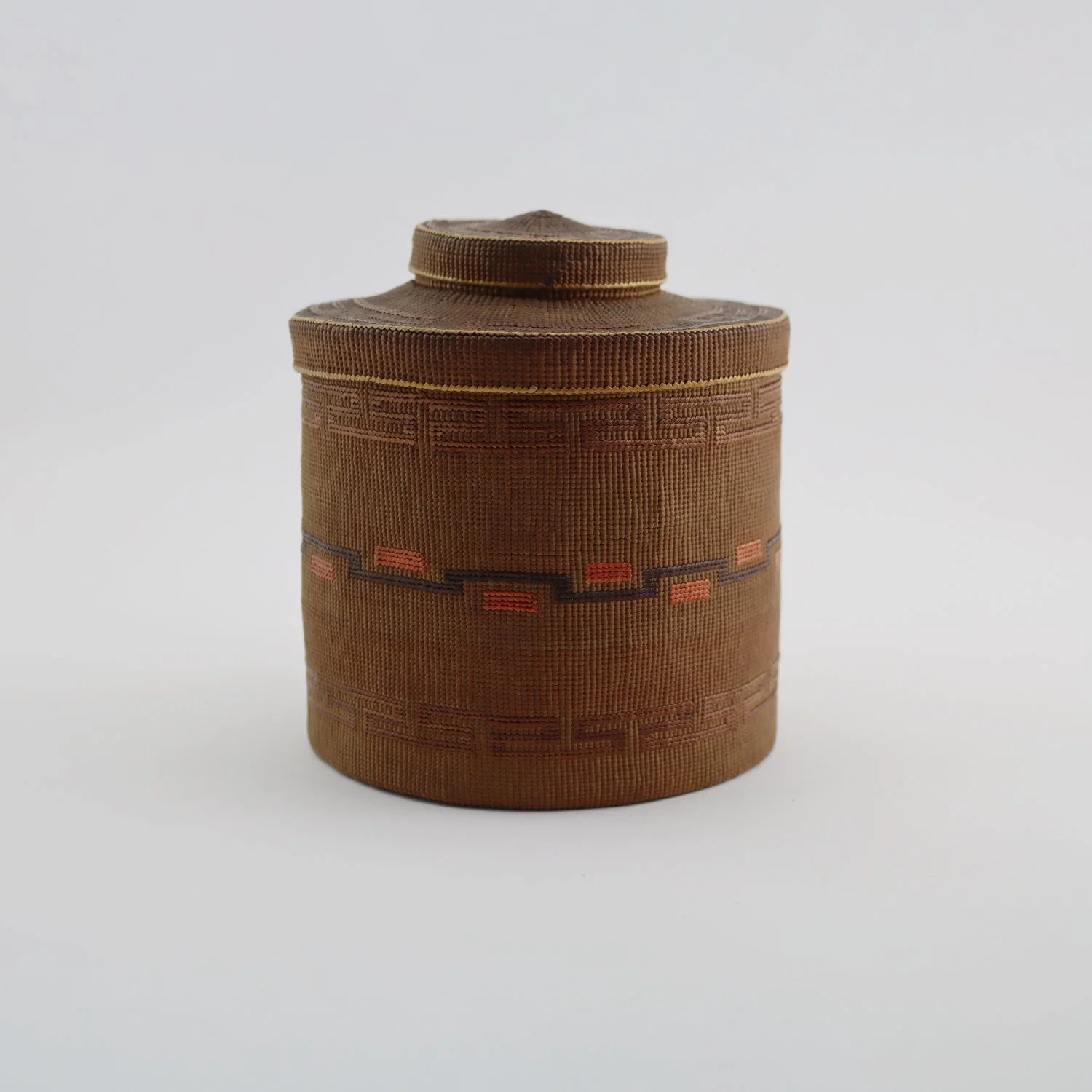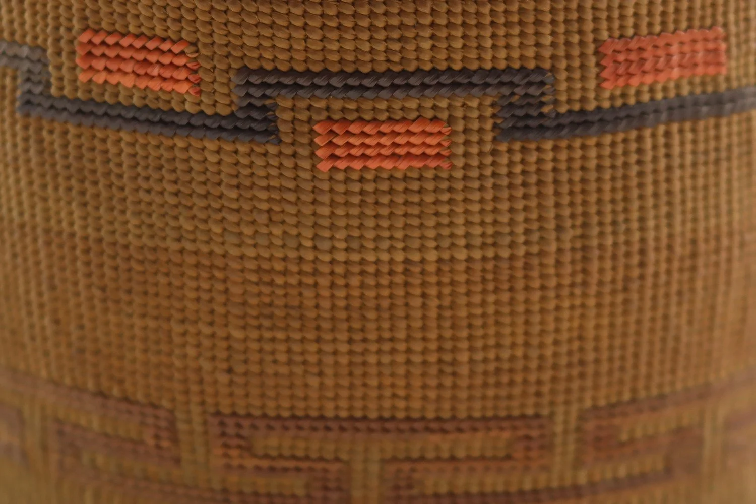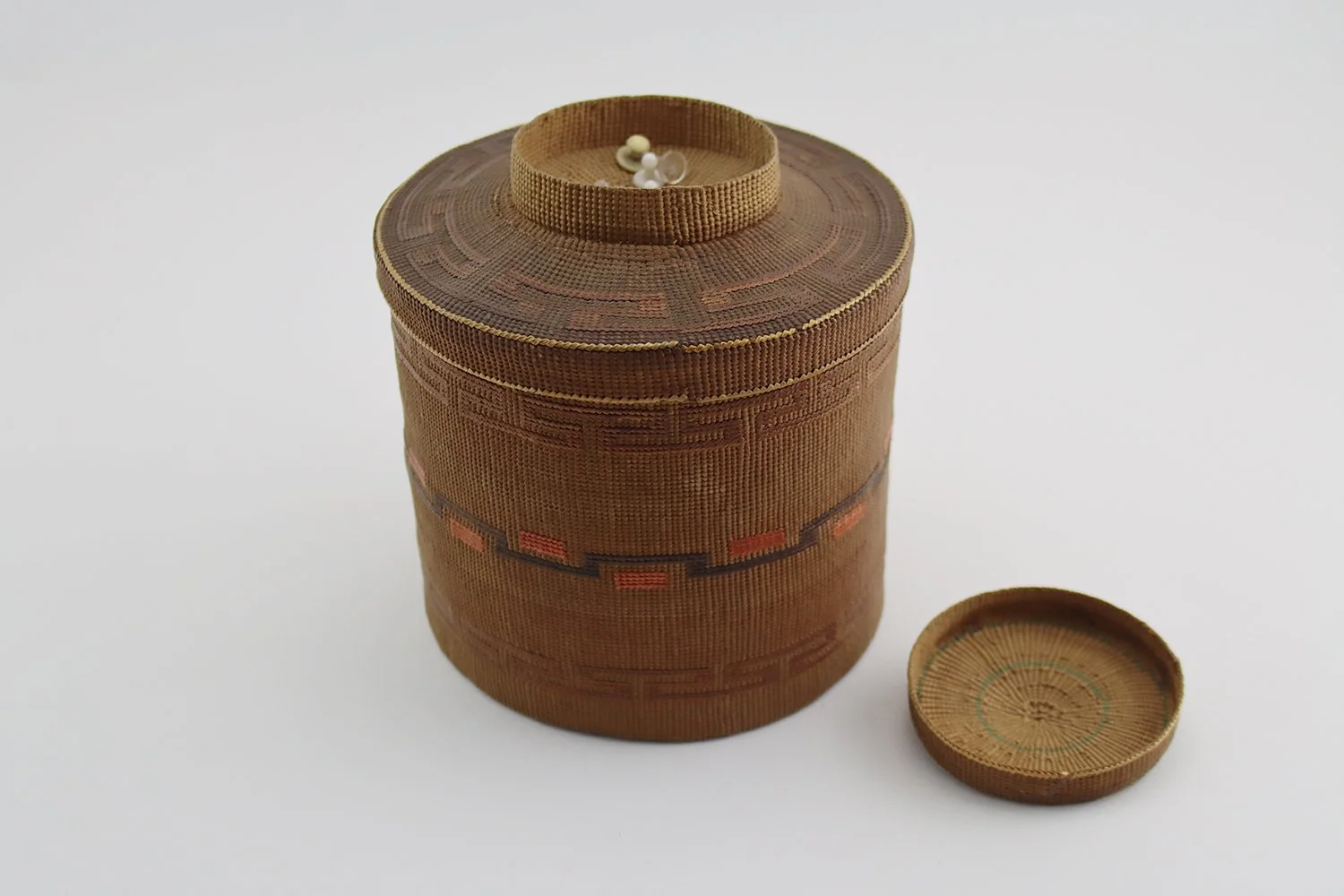 Rare very fine Nootka or Tsimsian round lidded basket for neck collars, with double lid, decorated with geometric design on sides, top and lid, minor dmage, early 20th century