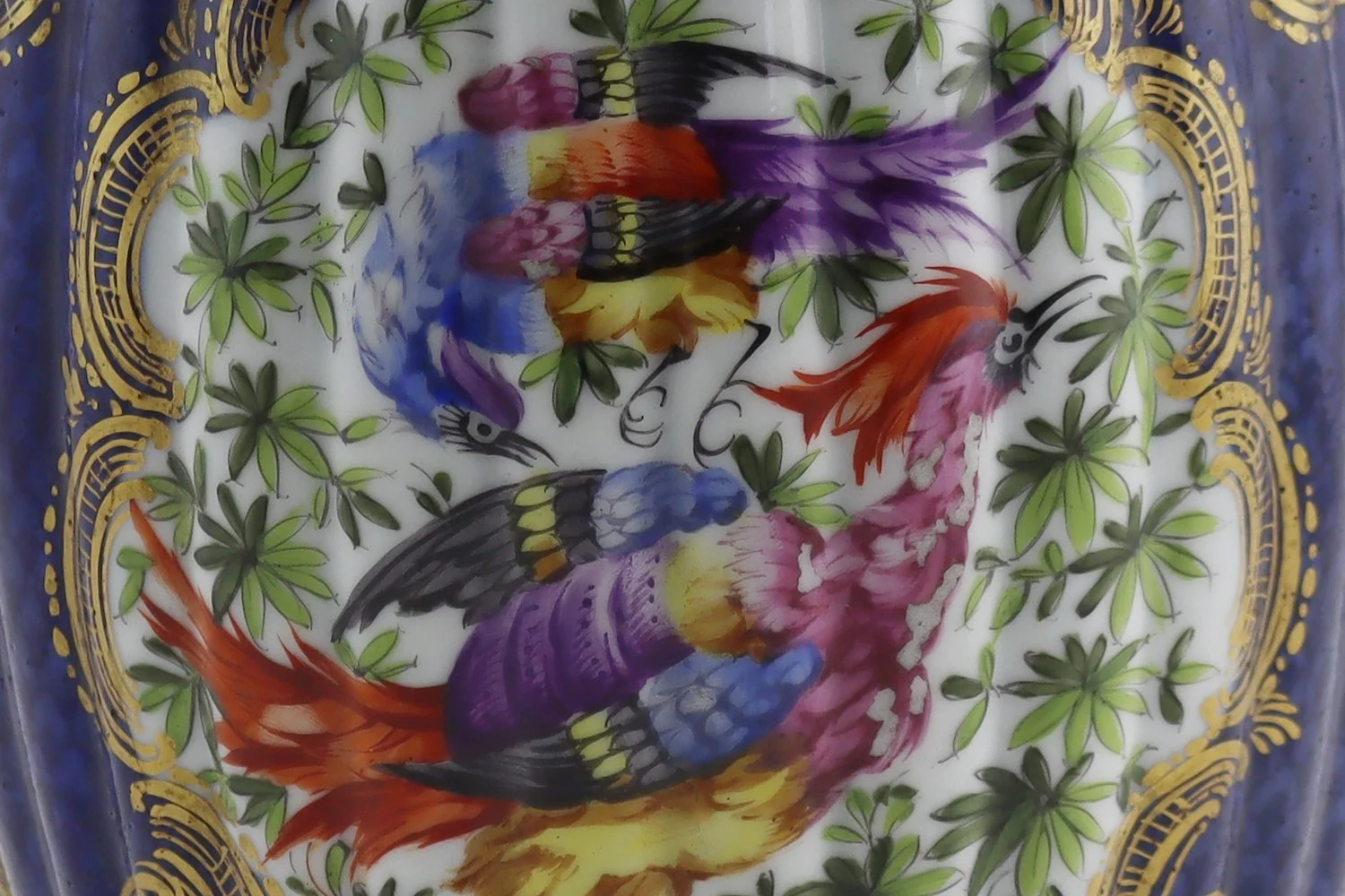 French porcelain lidded jar with scalloped sides, decorated in the 18th century "Chelsea Bird" pattern in the style of James Giles (1718–1780), three panels depicting birds on white background, six small panels with insects, top with three panels with flowers, highlighted with gilding, all on a magazine blue scale ground, minor chip, bottom marked for La Courtille Paris (1771-1840)