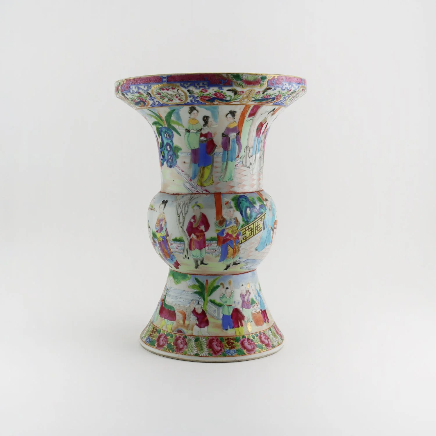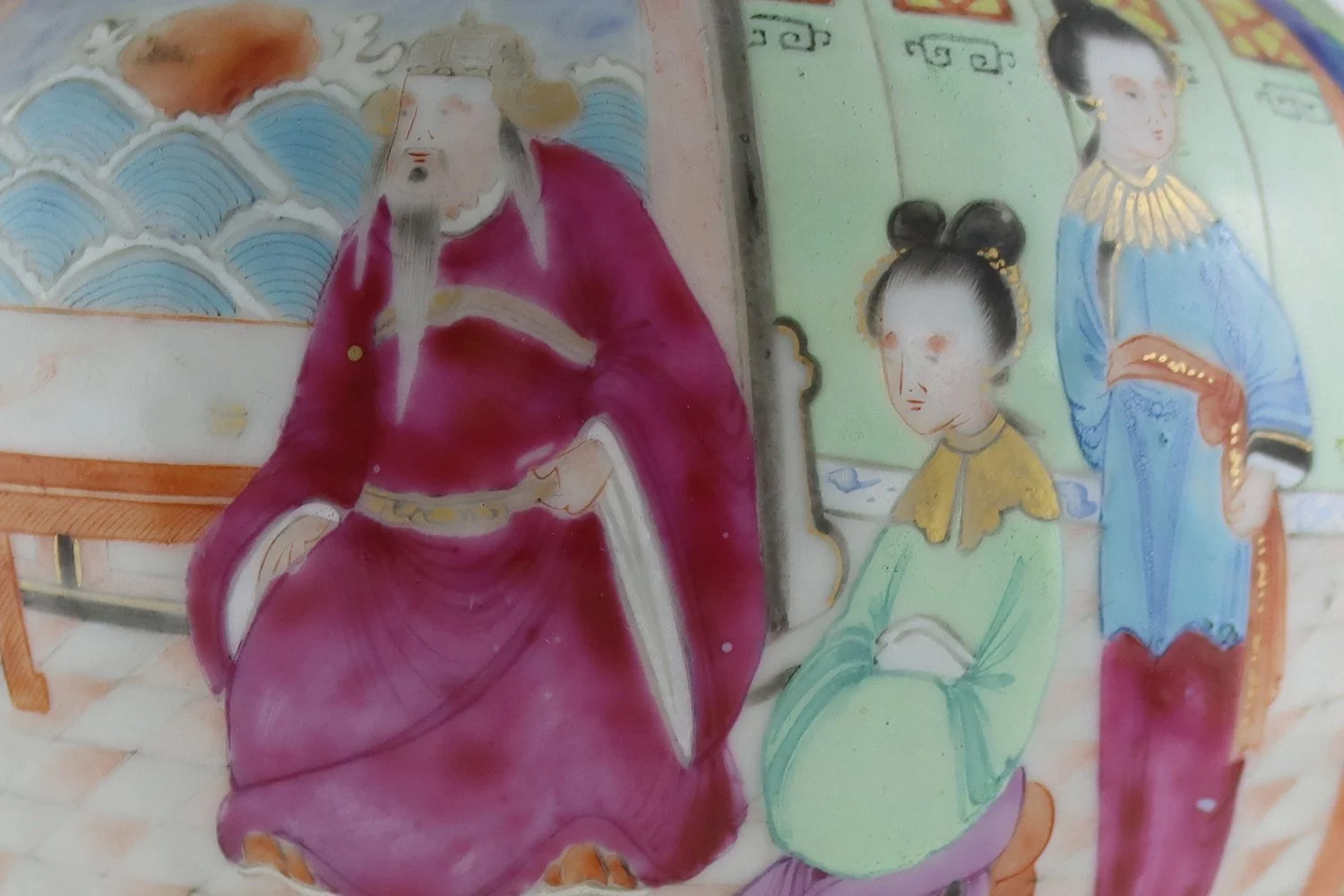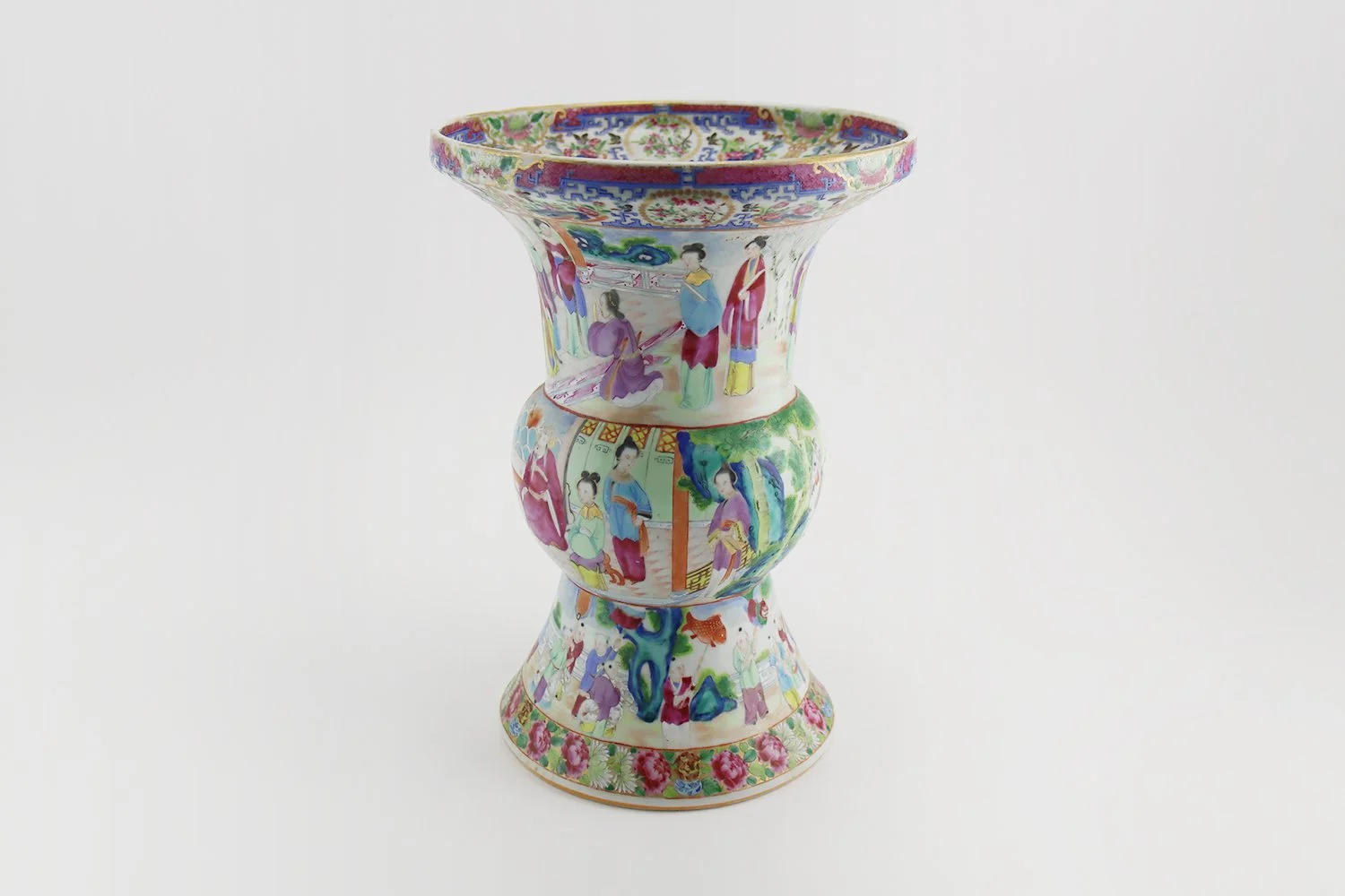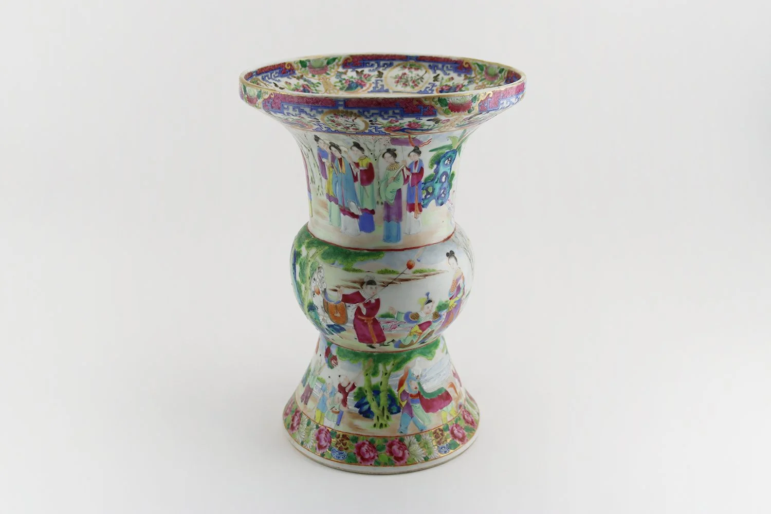 Chinese round vase with fluted rim, decorated with famille rose figures and flowers, the inside of the top rim decorated, mid to late 19th century.
