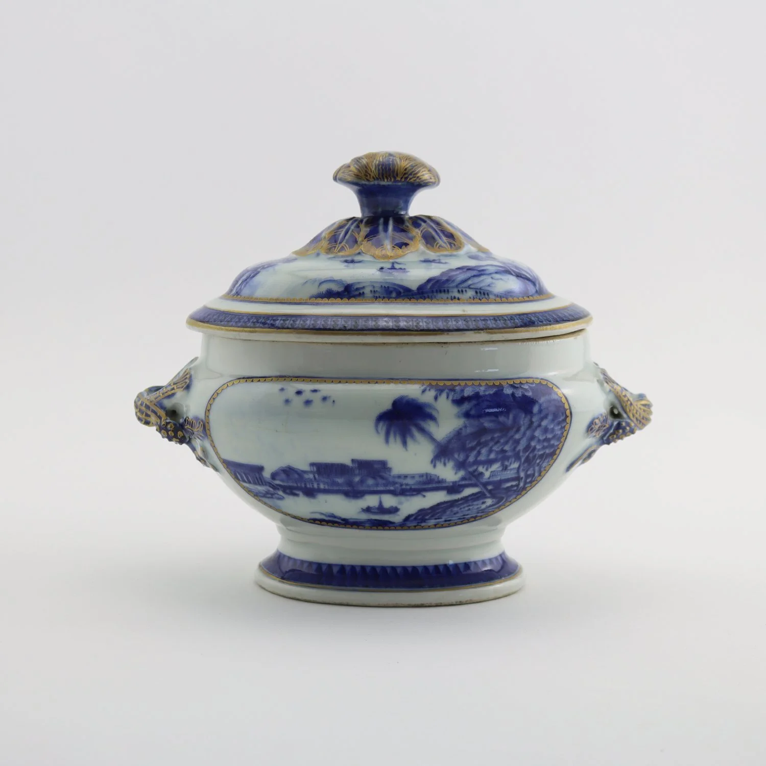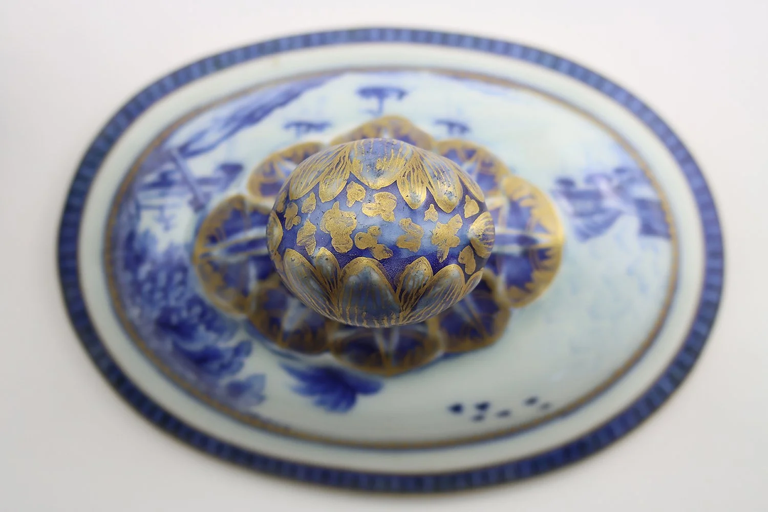 Chinese lidded tureen with blue and white decoration highlighted with gold, late 18th century
