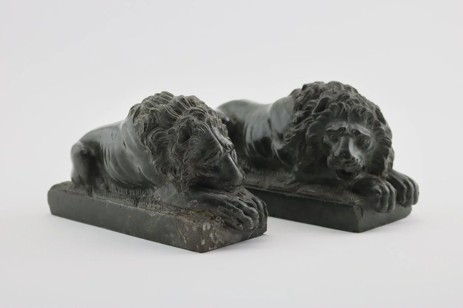 Pair of serpentine green marble Grant Tour carvings depicting recumbent lions on rectangular bases, after the monumental pair of beasts carved for the tomb of Pope Clement XIII in St. Peter’s, Rome in 1792 by Antonio Canova (1757-1822). European 19th century. Size: 3 ¾ x 7 ¼ x 2 ¾ and 3 ¾ x 6 ¾ x 2 ¾ in. M21510