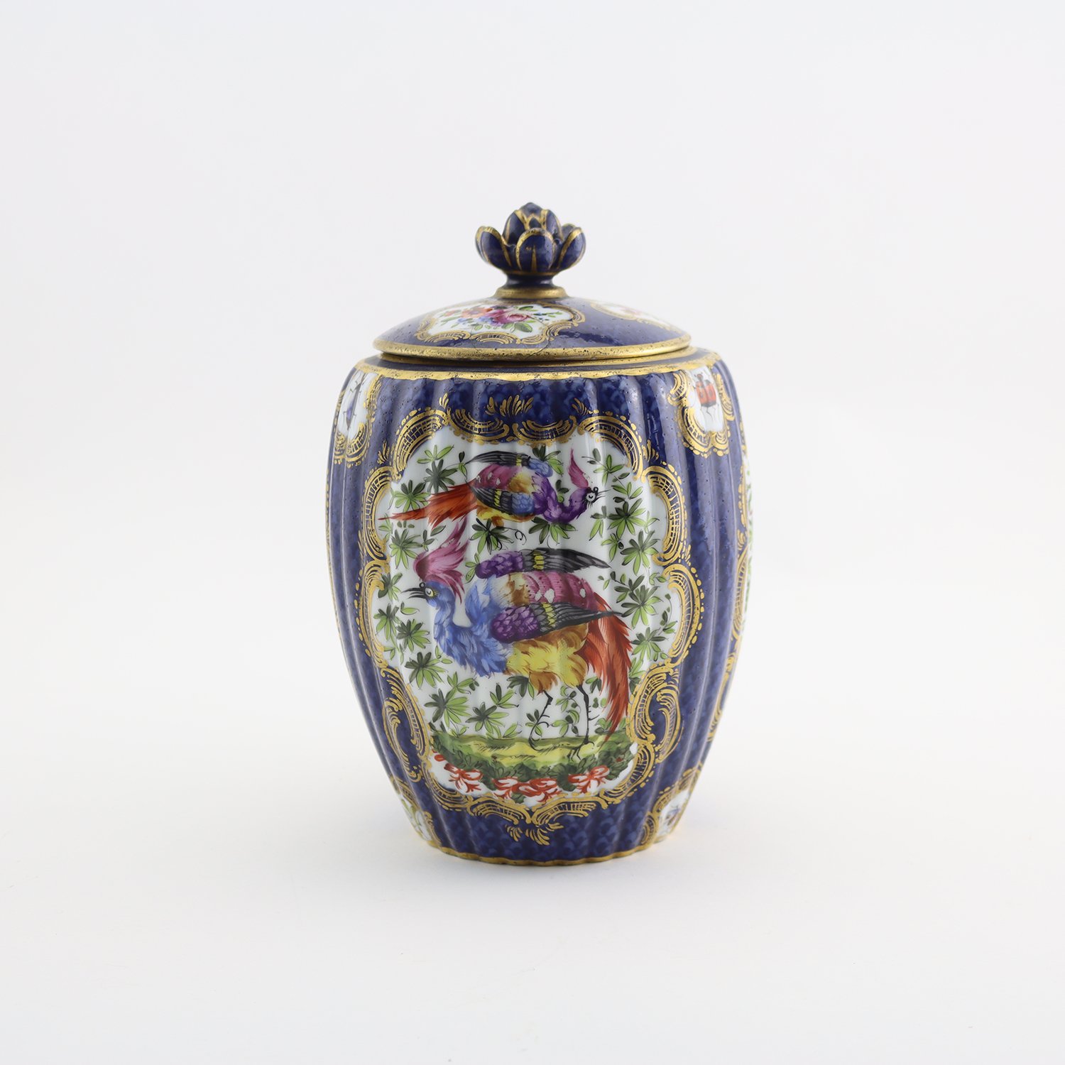 French porcelain lidded jar with scalloped sides, decorated in the 18th century "Chelsea Bird" pattern in the style of James Giles (1718–1780), three panels depicting birds on white background, six small panels with insects, top with three panels with flowers, highlighted with gilding, all on a magazine blue scale ground, minor chip, bottom marked for La Courtille Paris (1771-1840). Size: 8 h x 5 x 5 d E21754