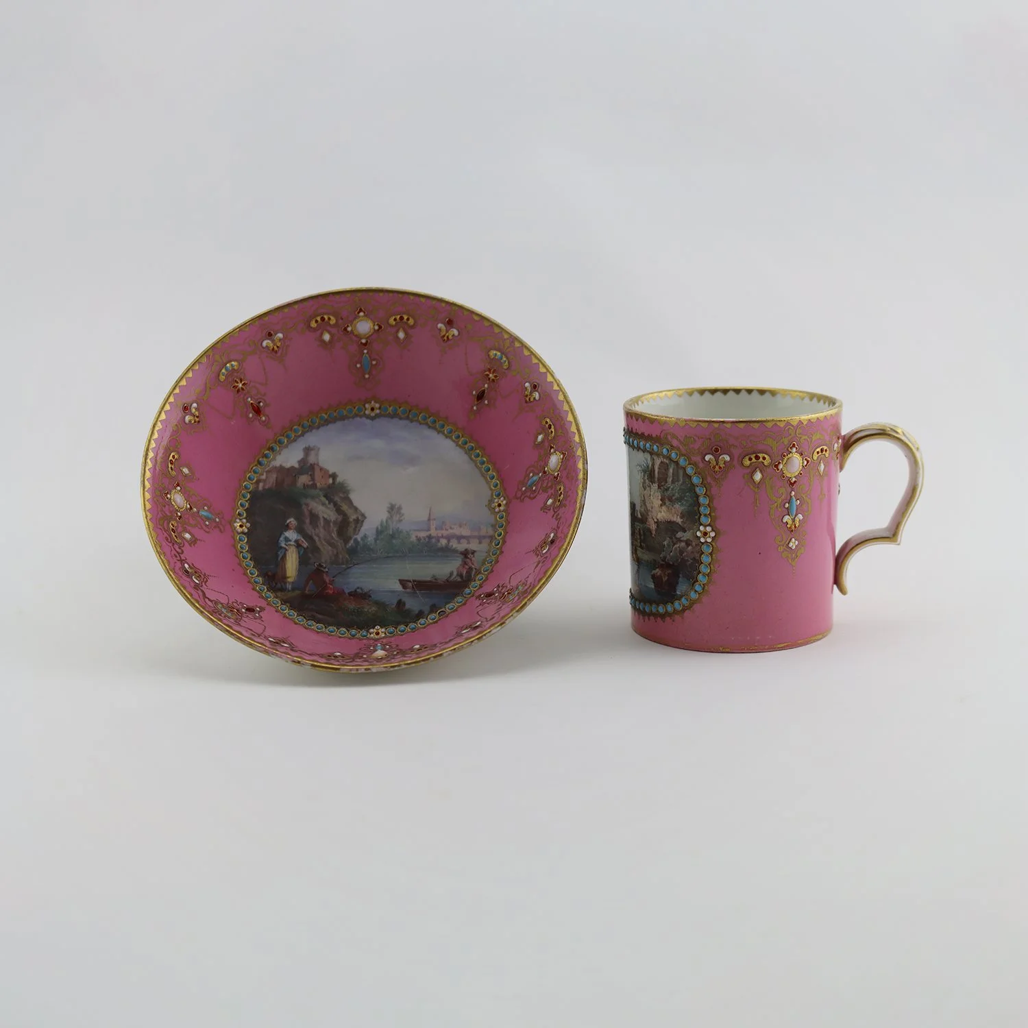 Sevres jeweled cabinet cup and deep saucer, both cup and saucer with painted Sevres date mark for 1778 and maker's mark for Louis-Gabriel Chulot (1755-1800), the cup and saucer vignettes with fine hand-painted landscapes, figures and boats, in fitted box. Size: cup 3 h x 2 ¾ w x 3 7/8 in, saucer 1 5/8 h x 5 5/8 d in. E21523