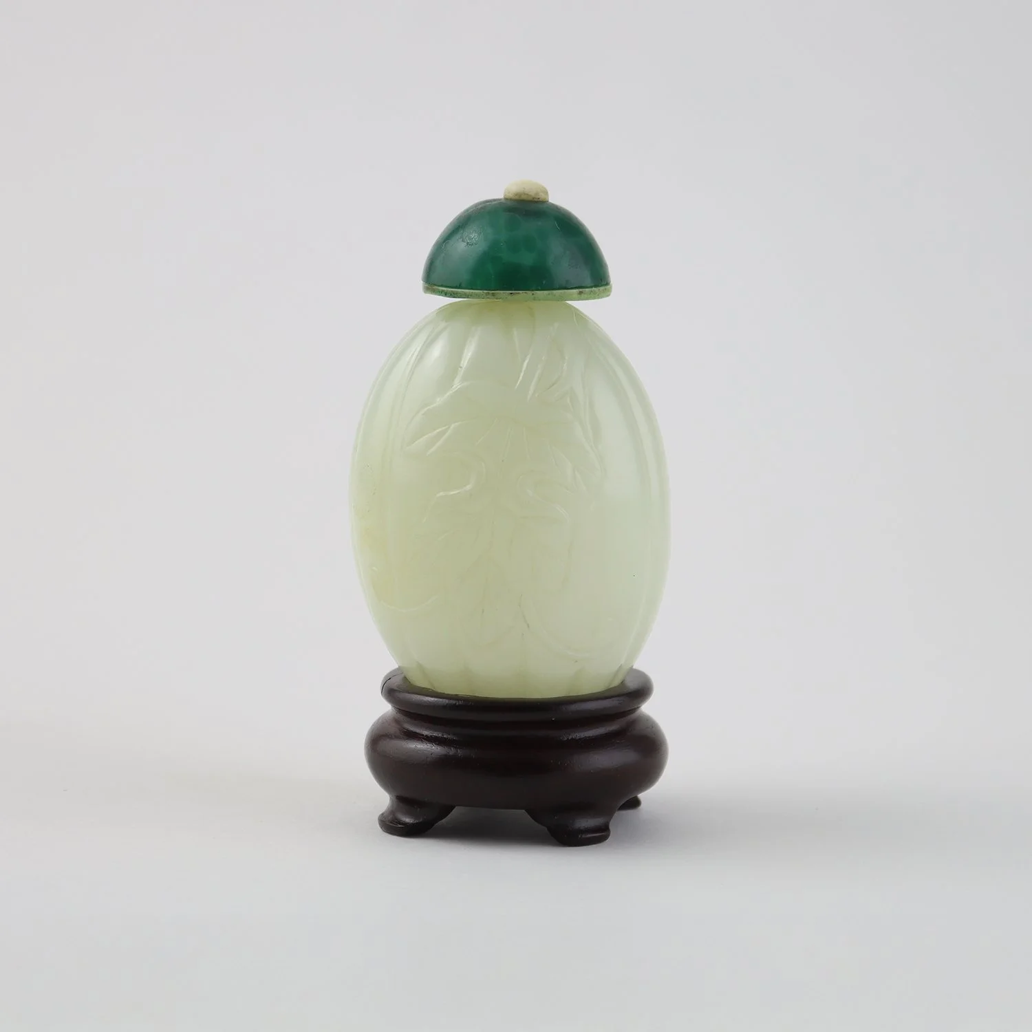 Chinese white jade carved melon form snuff bottle, carved as a melon with incised ribs and leaf on side, well hollowed, with later jadeite and glass stopper, on carved wooden stand, 18th century.