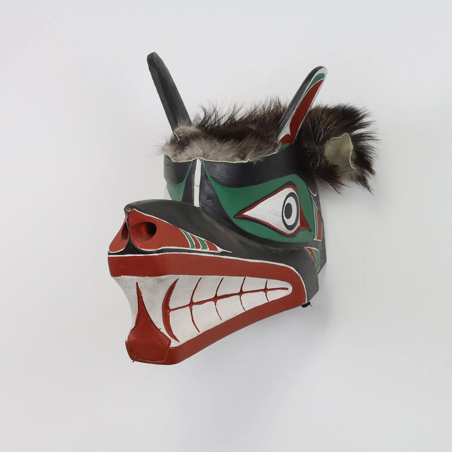 painted wood and fur wolf mask, has been danced, signed "Tom Willie"