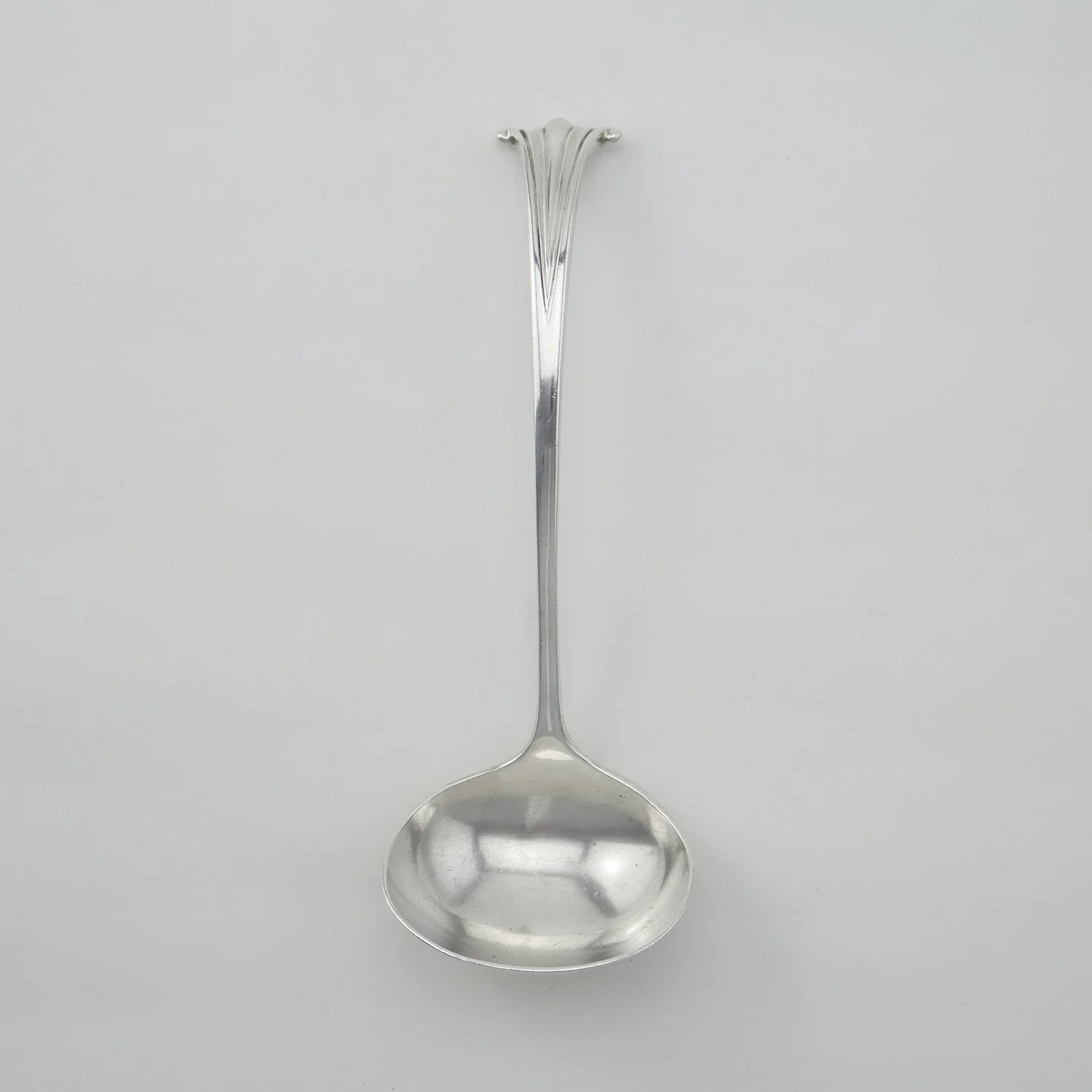 Today’s ladle form with its long, thin handle ending in a bowl first appeared during the Roman era, and over time was created from many metals and materials. The first sterling silver ladles were produced in England starting in the 13th century, and were extremely rare until the 18th century. Used to serve liquid from tureens or ceramic bowls, the thin gooseneck handle and dipping cup of the ladle were formed to compliment the design of the tureen. The punch ladle design had a large ladle with a cup big enough to fill a glass. The ‘toddy’ ladle evolved from the Scottish Hogmanay New Year tradition to provide a warm drink, or Het Pint, to greet the New Year. With a smaller than normal cup designed to serve the correct amount of toddy, the handle was often crafted from wood, whalebone or baleen, and horn, later with the addition of silver and sometimes decorated with a coin.