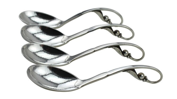 Set of four ornamental sterling silver serving spoons, blossom pattern #21, with Georg Jensen