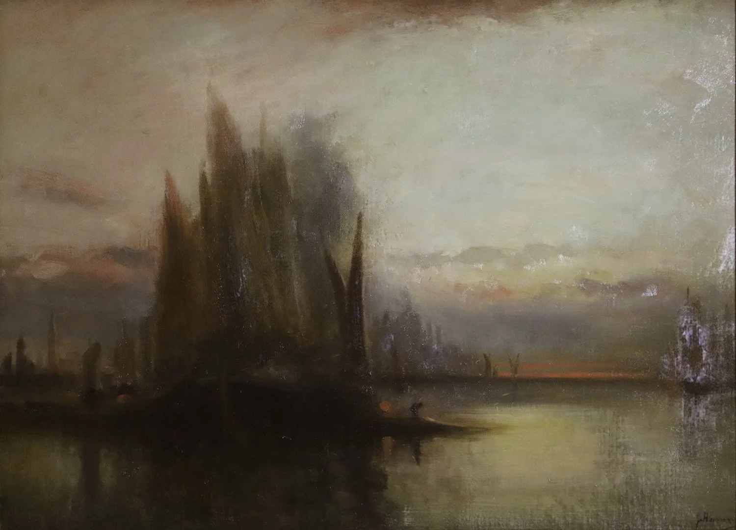 Hammond moved to New Brunswick where he became the Principal of Mount Allison Ladies College, where he lived for the rest of his life. He sailed to europe regularly where he painted with James McNeill Whistler in Holland, with Francoise Millet at Barbizon in France, and later to Italy where he produced a large number of works. He exhibited at the Paris Salon, winning two awards in 1886. In 1920, he had a solo exhibition at the Jenkins Gallery, of which The Toronto Star Weekly noted, “There are pictures of Holland in winter, of coast farms, and tree bordered roads, but one feels that Mr. Hammond is essentially a painter of the sea and of the harbour, with its shipping, and that his greatest success are his atmospheric effects, when he fixes on canvas the prismatic beauty that comes from the sunlight struggling through the fog.”