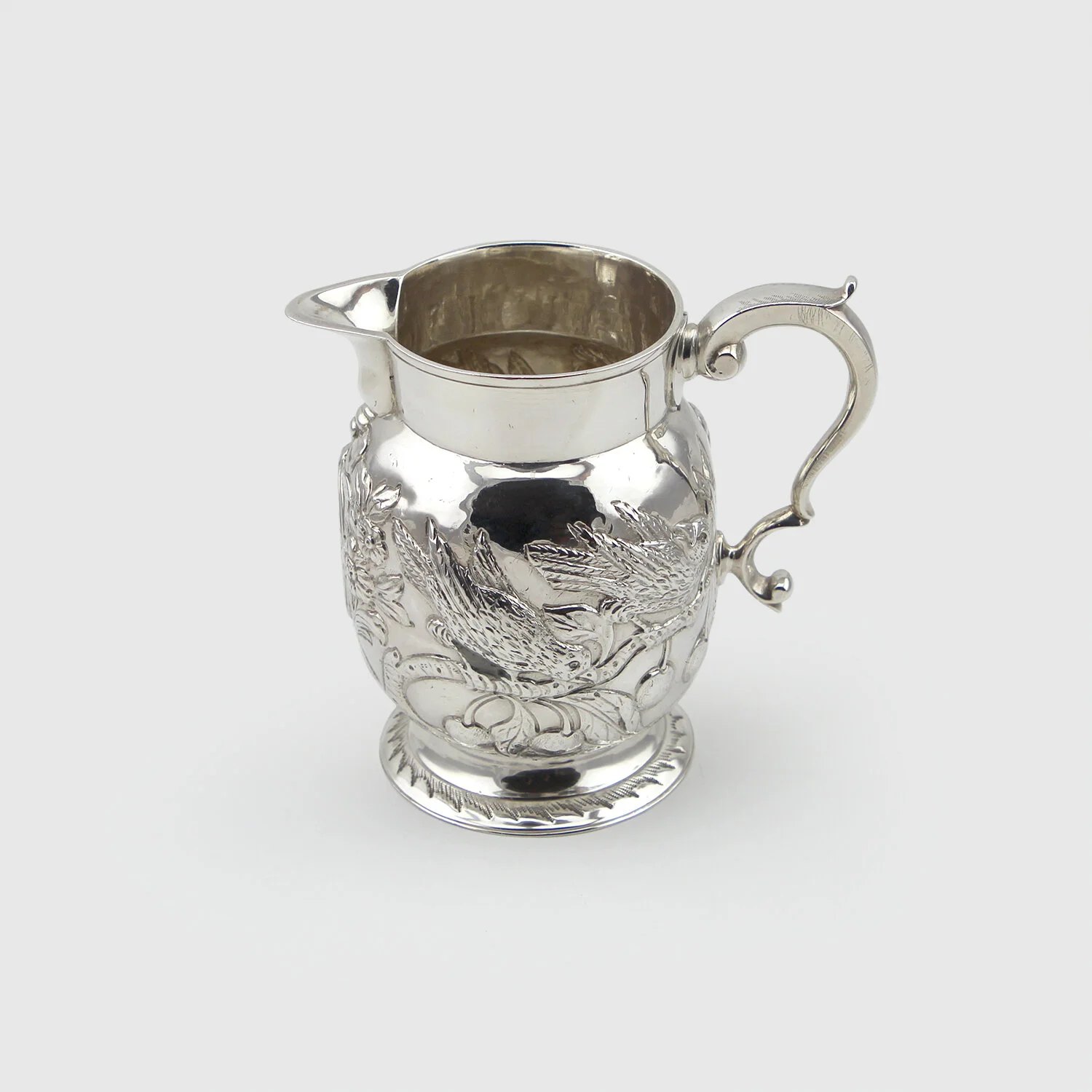 Sterling silver pitcher, the rounded body decorated with high relief chased repoussé decoration depicting birds, flowering and fruiting branches with a ribboned cartouche, marked for London 1947 and London Assay Office.