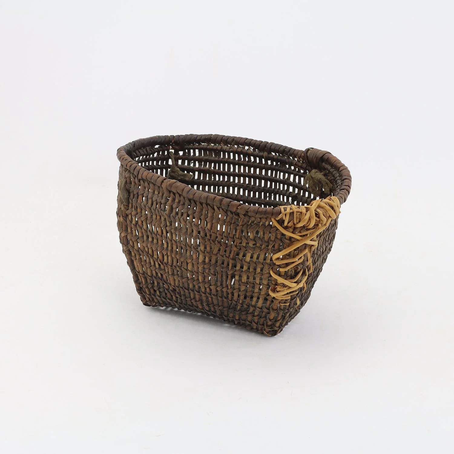 small rectangular woven open-work clam basket made of pealed cedar roots twined with split cedar stips, possibly for child, early 20th century, has been used