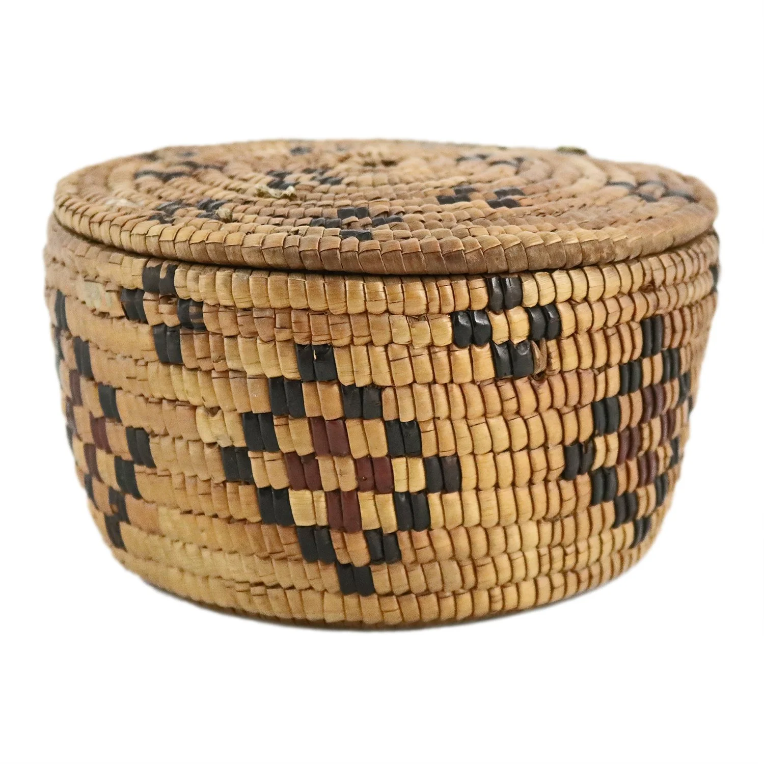 Small round fully imbricated lidded basket with lid, remnants of leather ties and decorated with checkered diamond pattern, early 20th century