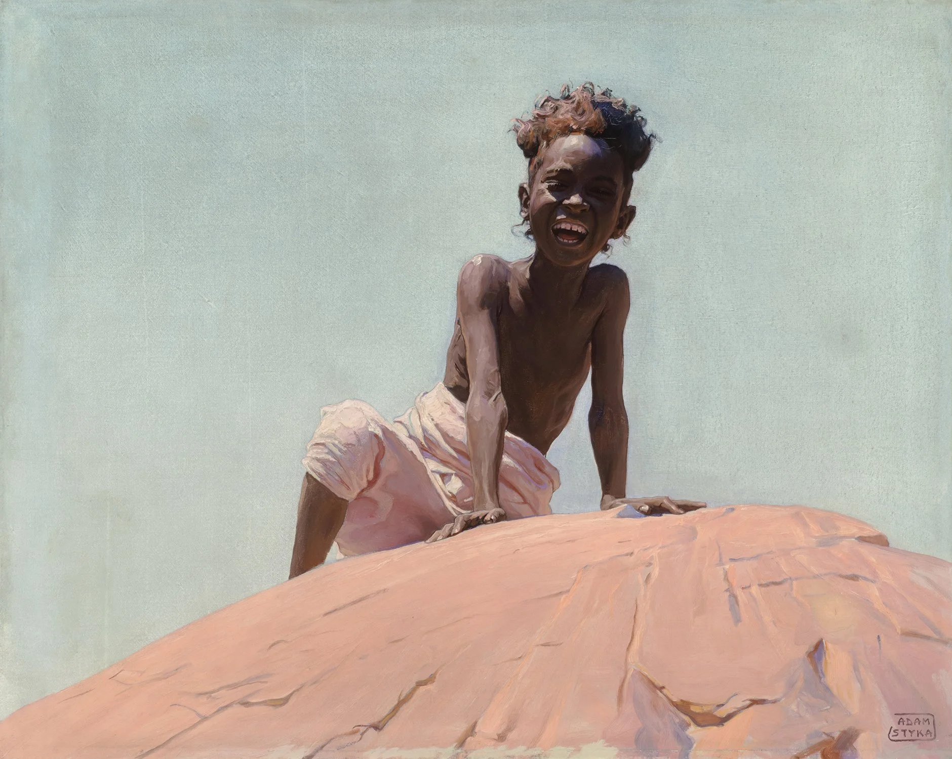 This painting epitomises Styka’s Orientalist style. We see a young boy emerging from behind a boulder, the smile on his face completely contagious. The sun combines with the red earth and landscape to imbue the canvas with a rich rose gold light. The painting highlights not only Styka’s accomplished technique but also his great love for North Africa, its people and its landscape.