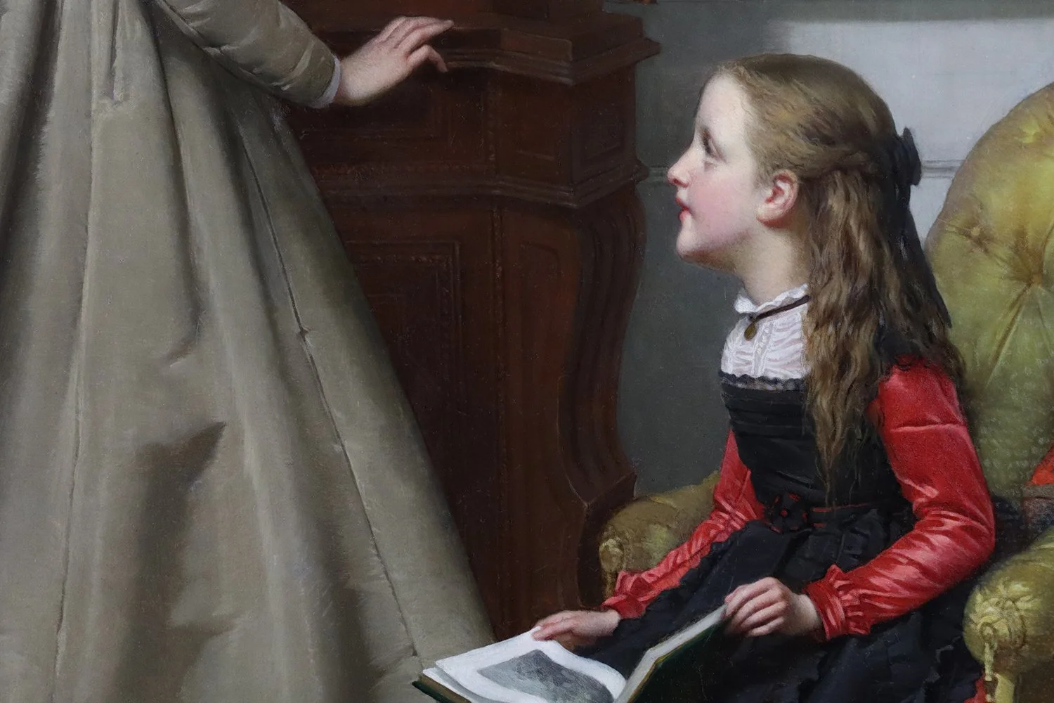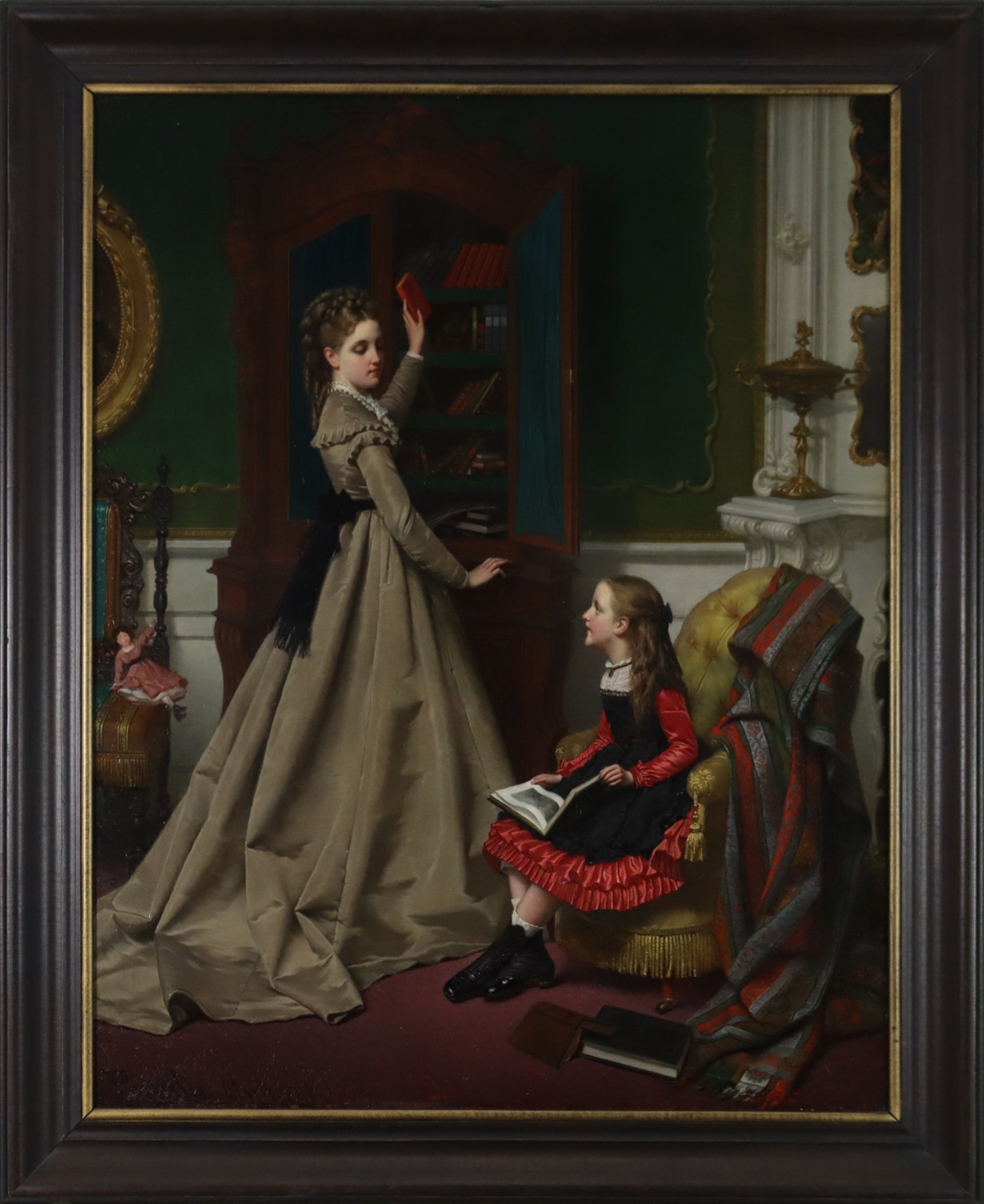 This lovely work perfectly epitomizes the artist’s talent and skill in depicting in detail the highly finished figures in interiors for which he is most sought after. The scene is centered around the two female figures and the intimacy of their gaze, the woman frozen in time as she chooses a book from the cabinet to give to the seated girl. The charming and intimate scene is elegantly curated; the room is beautifully composed, enhanced by the intricacy of the furnishings, delicate textures and multicoloured fabrics, the detail of the bookshelf and books themselves, and personal touches like the discarded doll. The painting gives us a glimpse into the privileged life of the bourgeoisie in nineteenth century Europe.