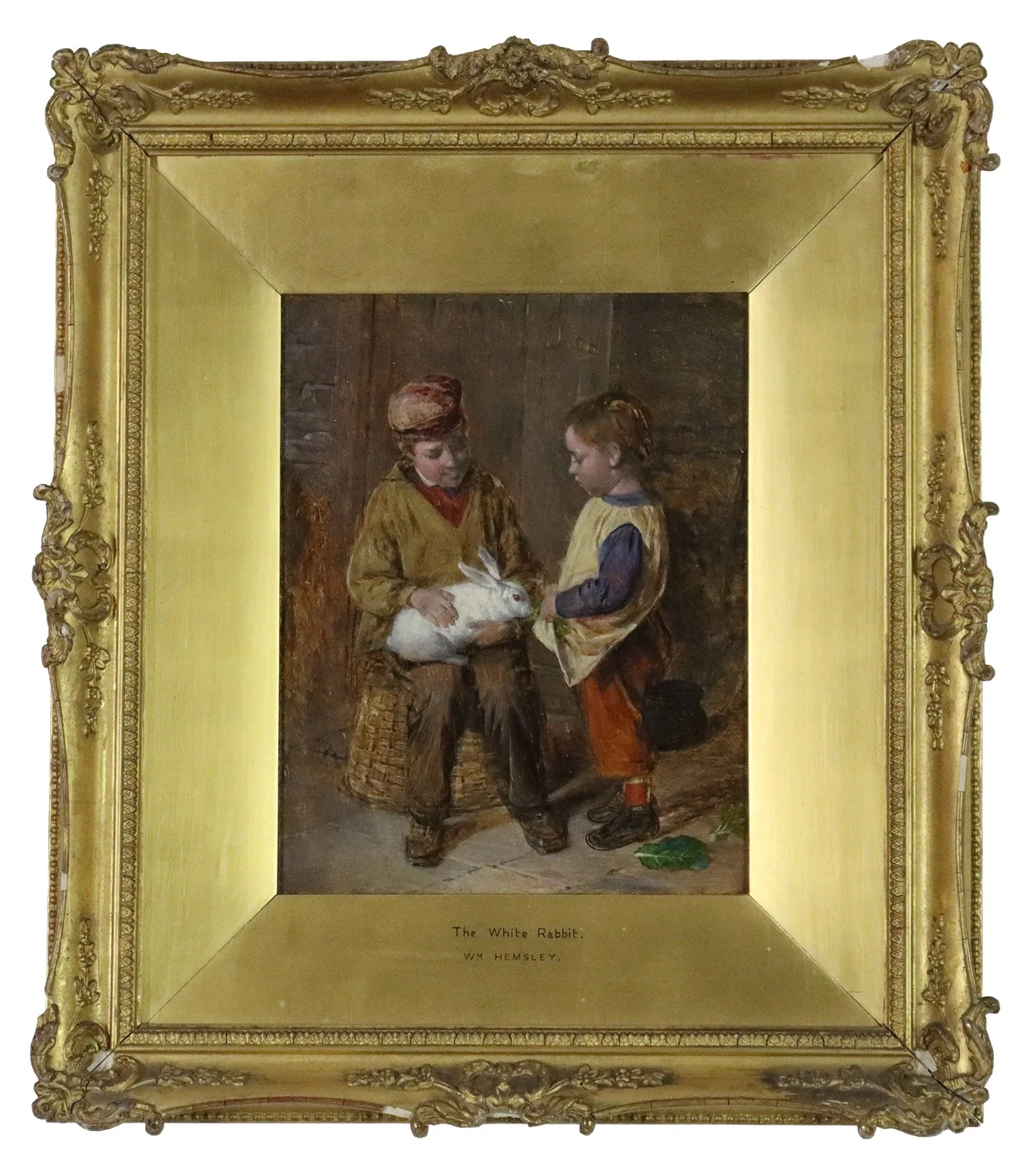 oil on panel, inscribed and signed on verso "The White Rabbit/Wm. Hemsley", with panel stamp "G. Rowney & Co. Prepared Mahogany Panel London St. 62 Rathbone Place", signed indistinctly lower left
